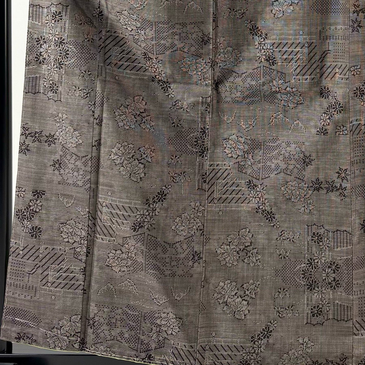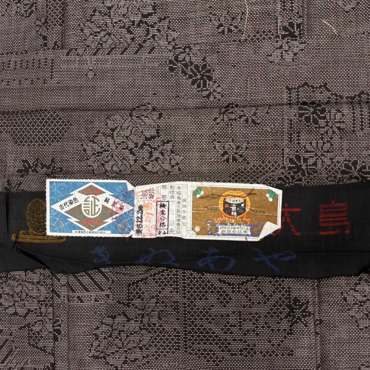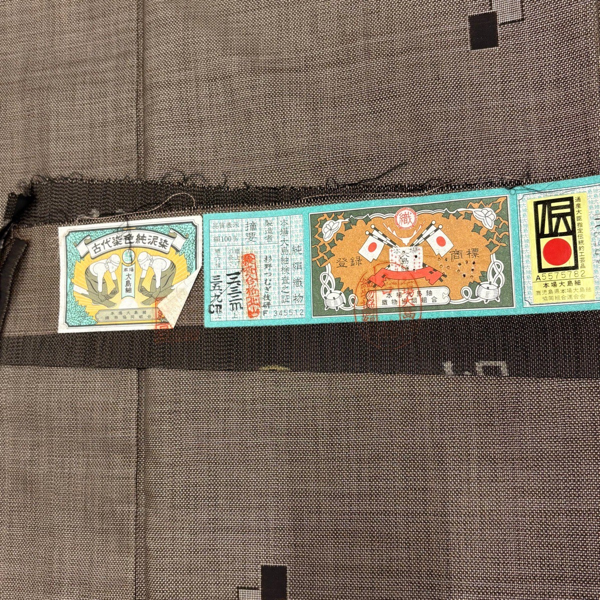 大島紬 身丈160cm 裄丈63cm S 袷 純泥染 証紙あり 竹 麻の葉 焦茶色 正絹 名品