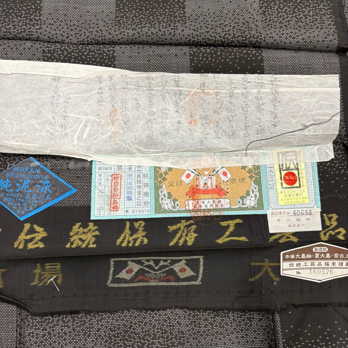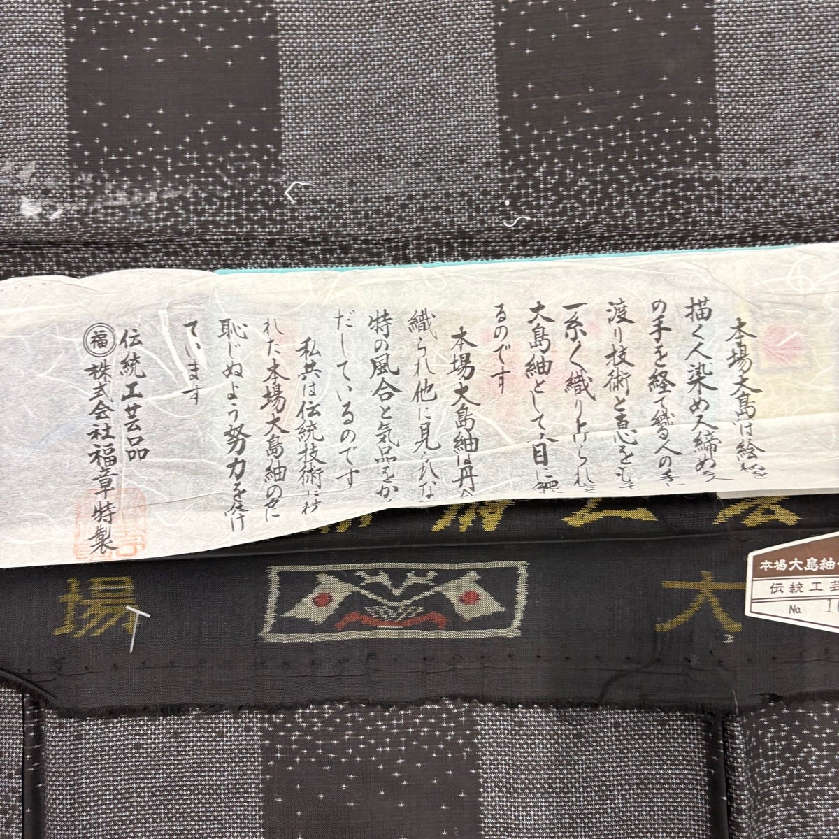大島紬 身丈157.5cm 裄丈62.5cm S 袷 純泥染 証紙あり 幾何学模様 焦茶色 正絹 名品