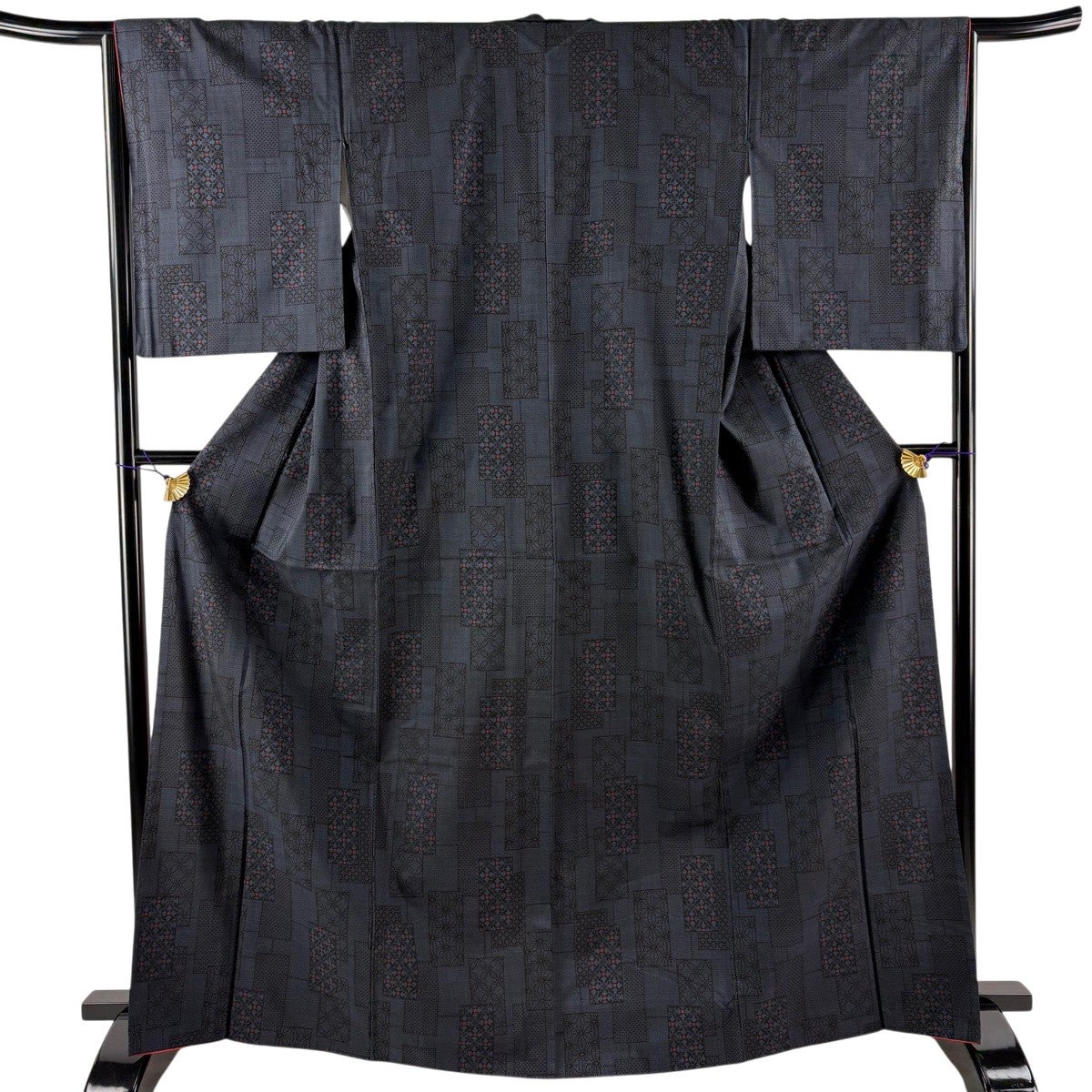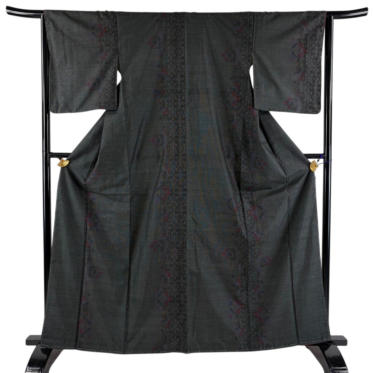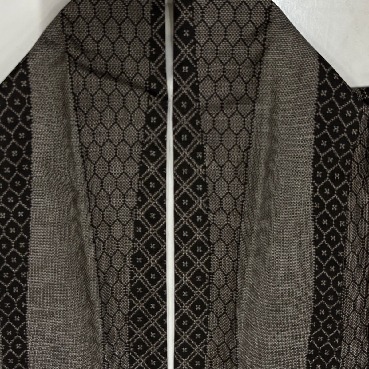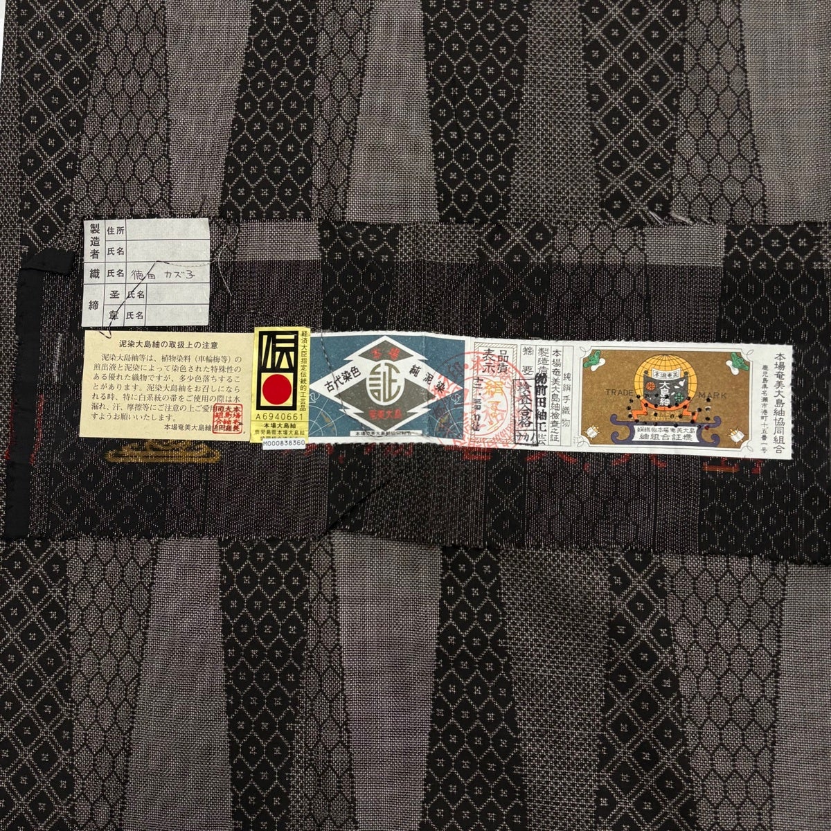 50%OFF 大島紬 身丈161.5cm 裄丈64cm M 袷 証紙あり 麻の葉 黒灰 正絹 名品 K50