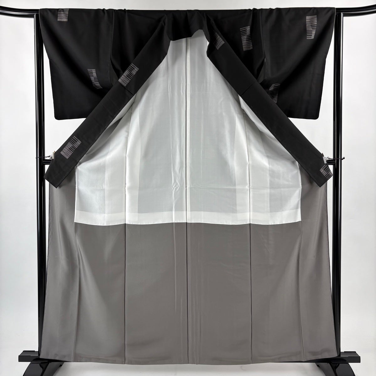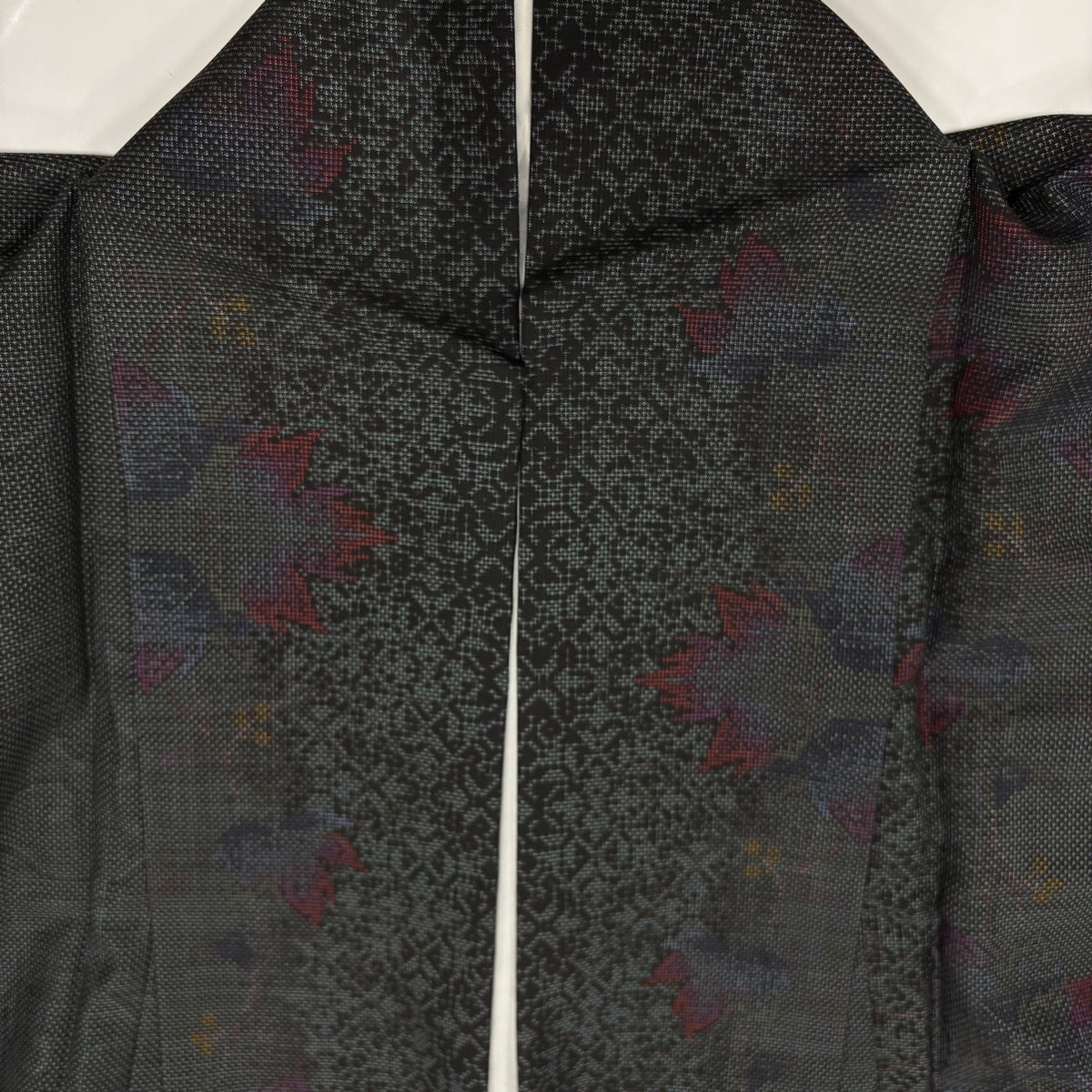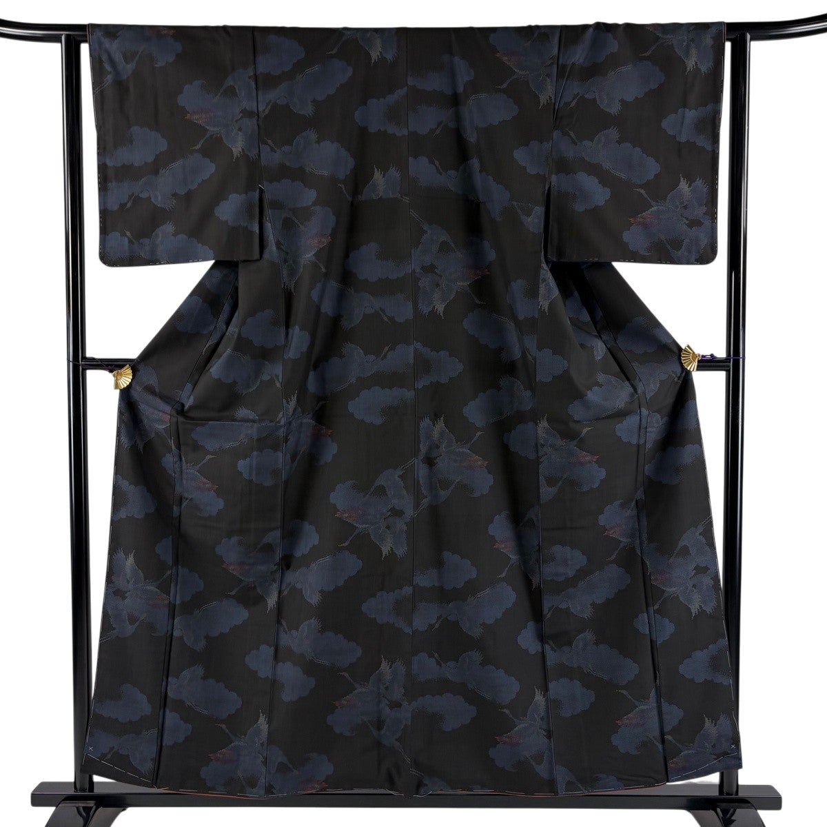 50%OFF 大島紬 身丈161.5cm 裄丈64cm M 袷 証紙あり 麻の葉 黒灰 正絹 名品 K50