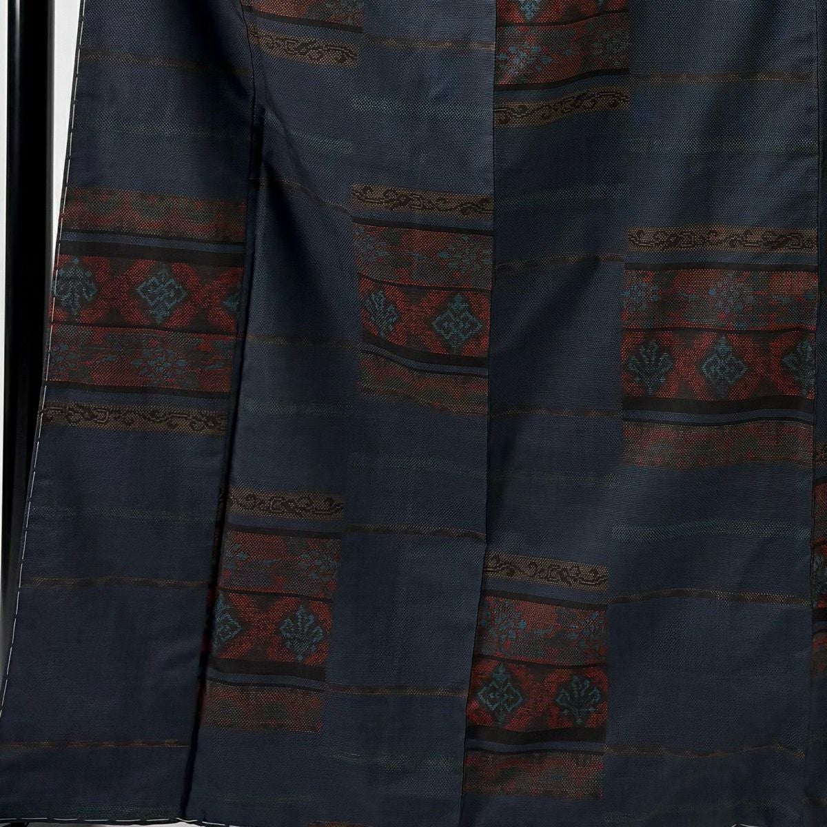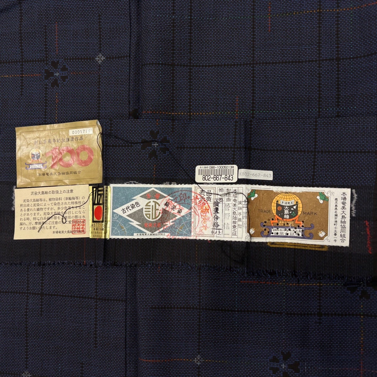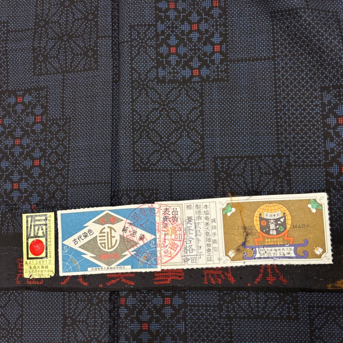 【美品】 大島紬 身丈168cm 裄丈65.5cm M 袷 純泥染 証紙あり 短冊 麻の葉 紺色 正絹 秀品