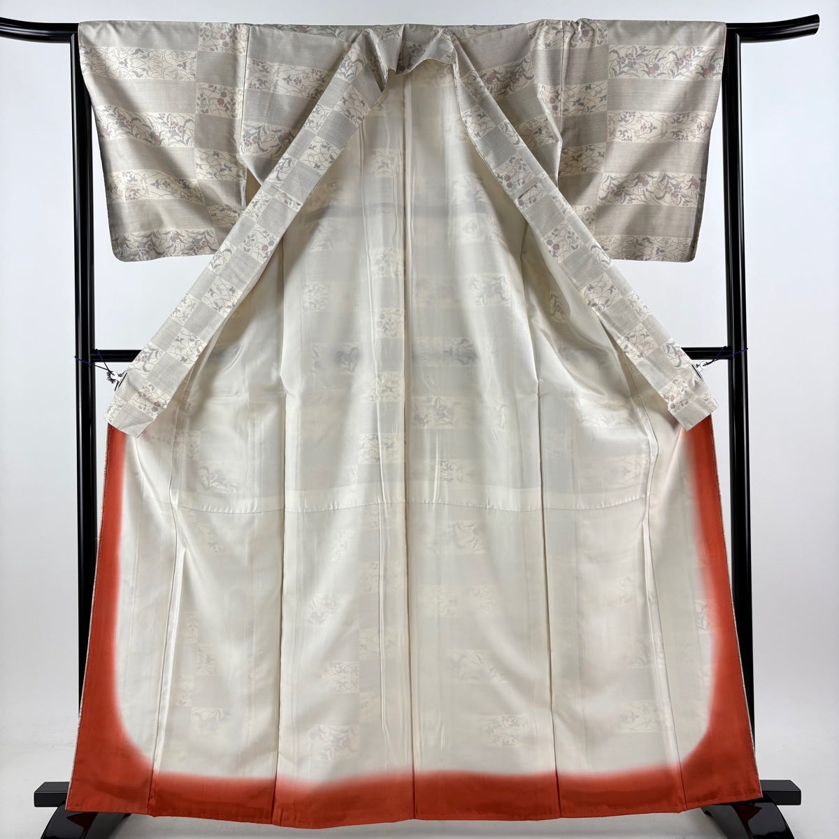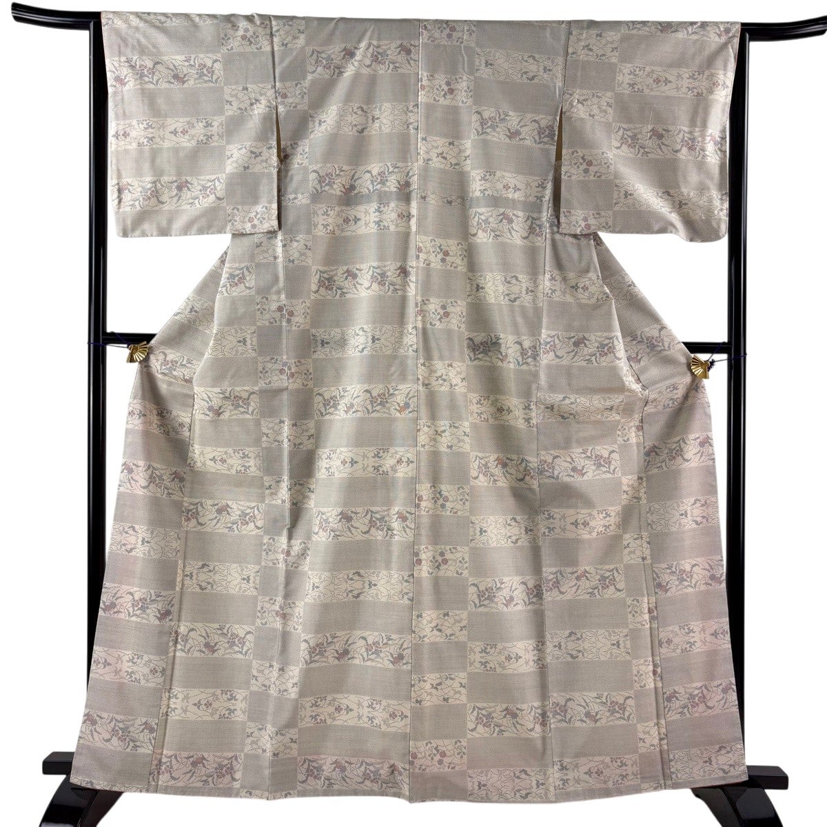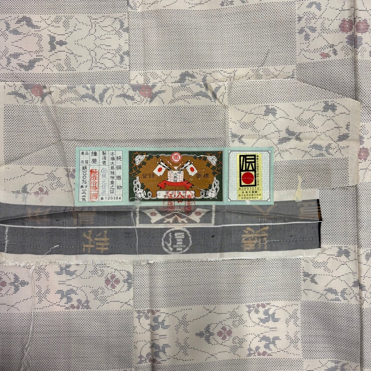 【美品】 大島紬 身丈164.5cm 裄丈64cm M 袷 証紙あり 草花 変わり市松 クリーム 正絹 秀品