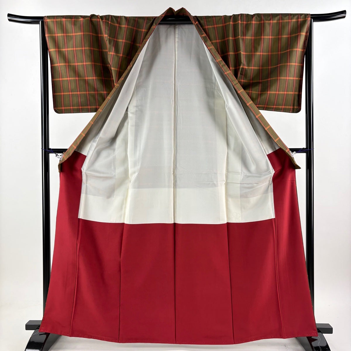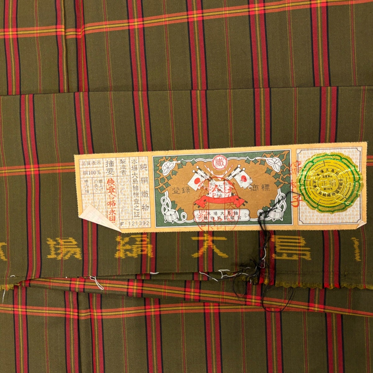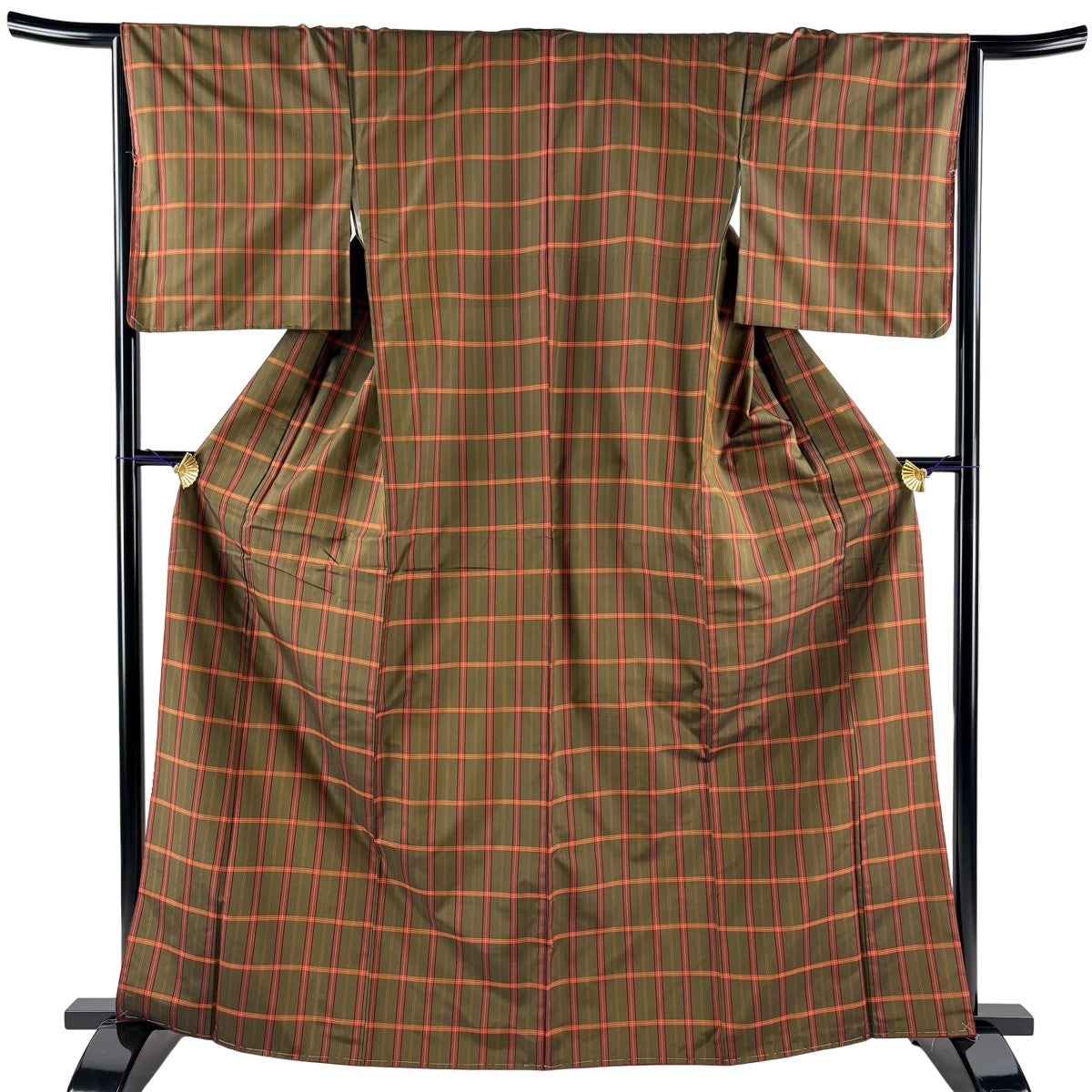 【美品】 大島紬 身丈164.5cm 裄丈65.5cm M 袷 バチ衿 証紙あり 縞 格子 茶緑色 正絹 優品