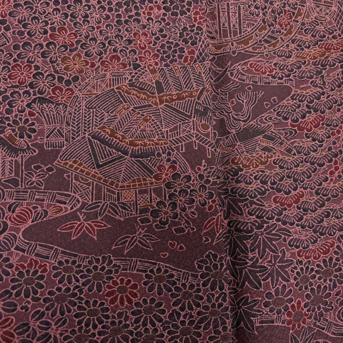 小紋 身丈159cm 裄丈65cm M 袷 松竹梅 建物 縮緬 灰紫 正絹 優品