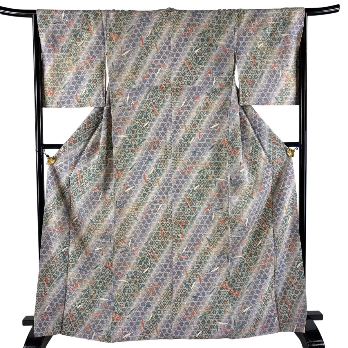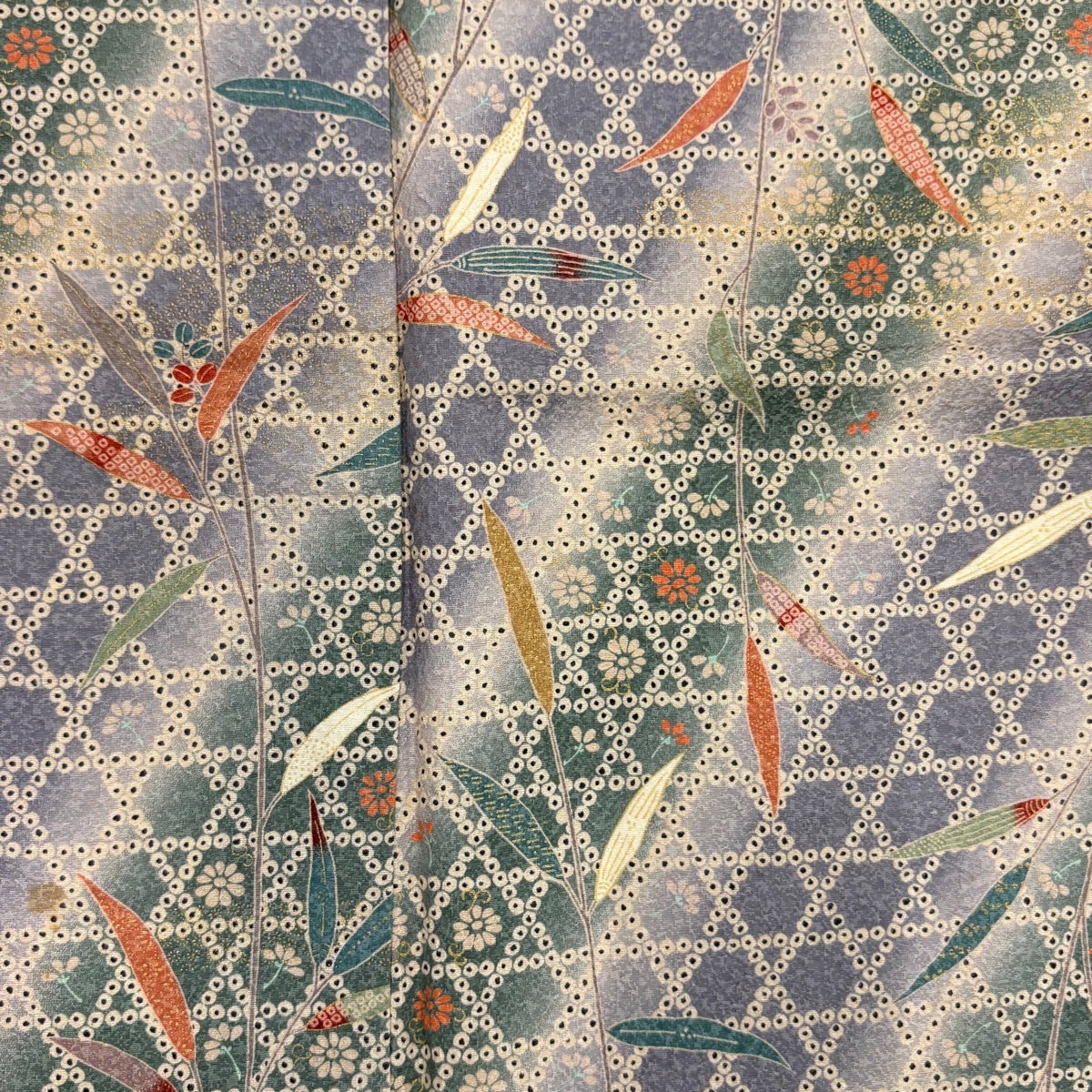 小紋 身丈166cm 裄丈65cm M 袷 籠目 葉柄 金彩 ぼかし 灰色 正絹 優品