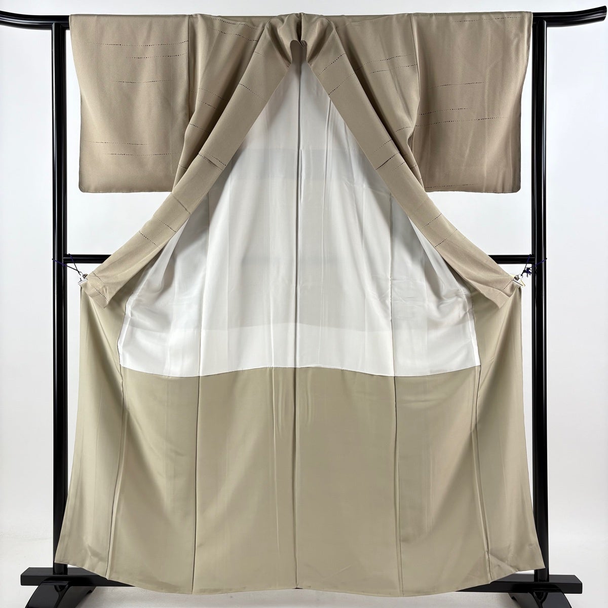 【美品】 小紋 身丈159.5cm 裄丈64cm M 袷 葉柄 地紋 ベージュ 正絹 秀品