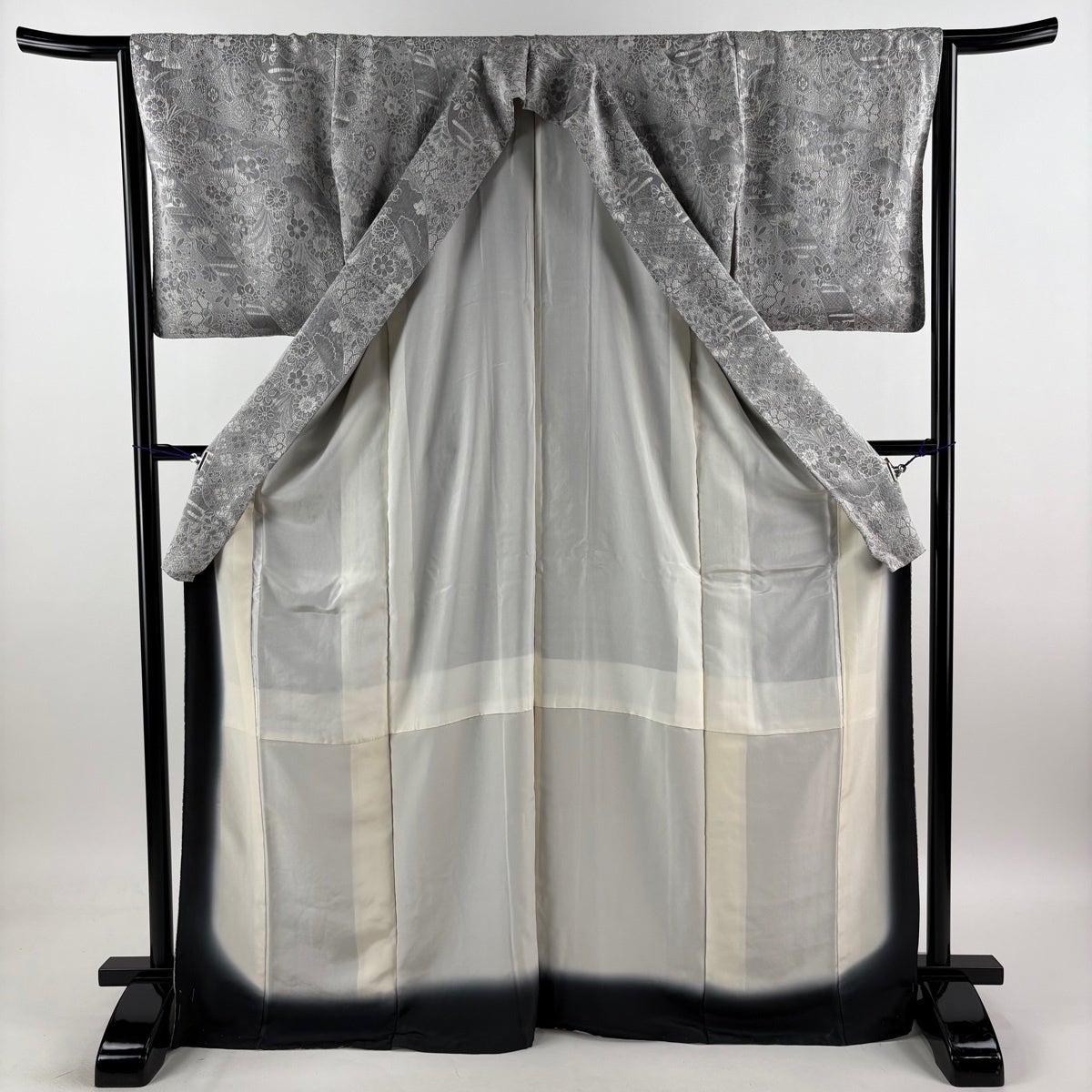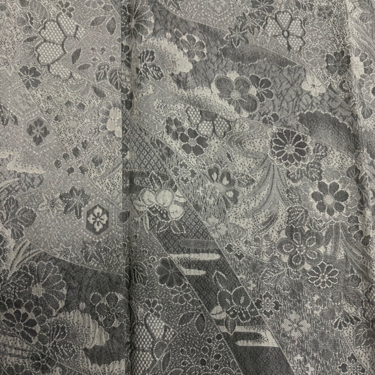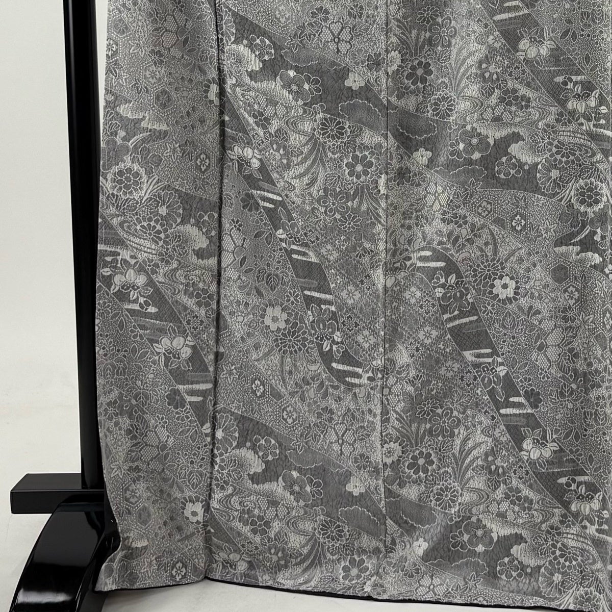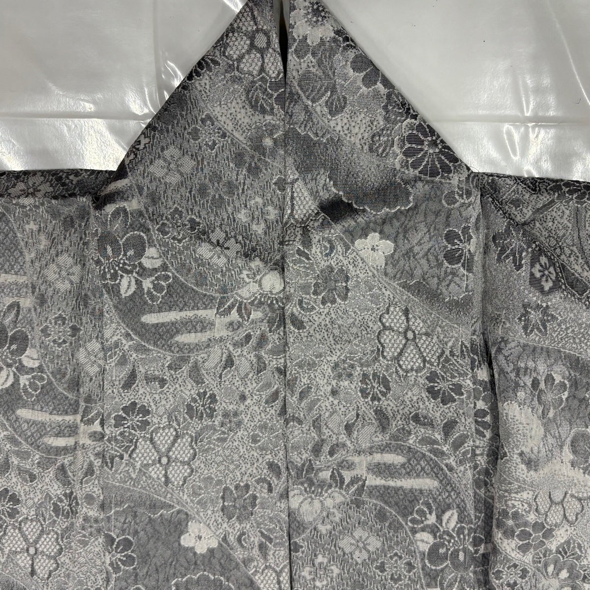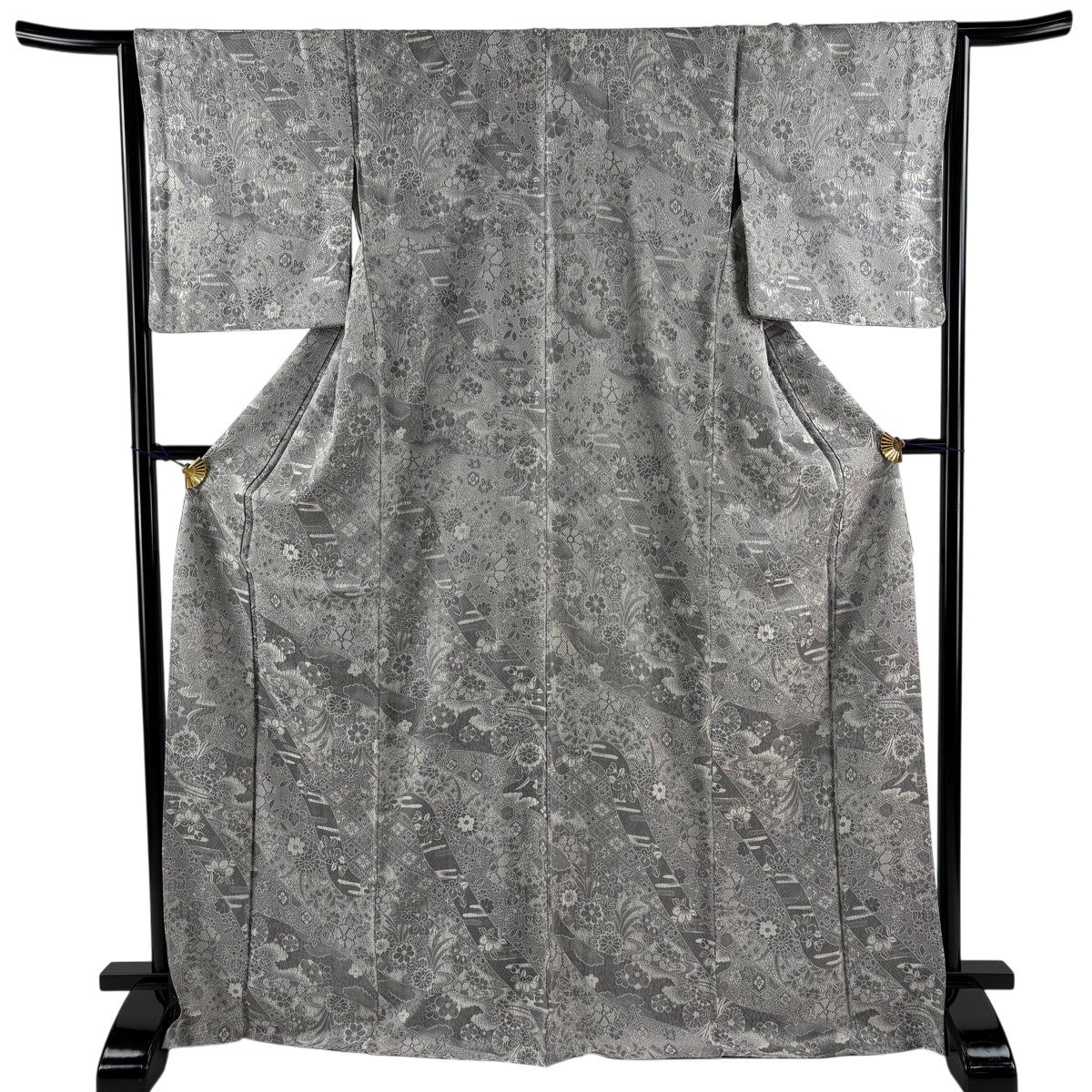 【美品】 小紋 身丈158.5cm 裄丈63.5cm S 袷 松梅 草花 紋意匠 灰色 正絹 名品