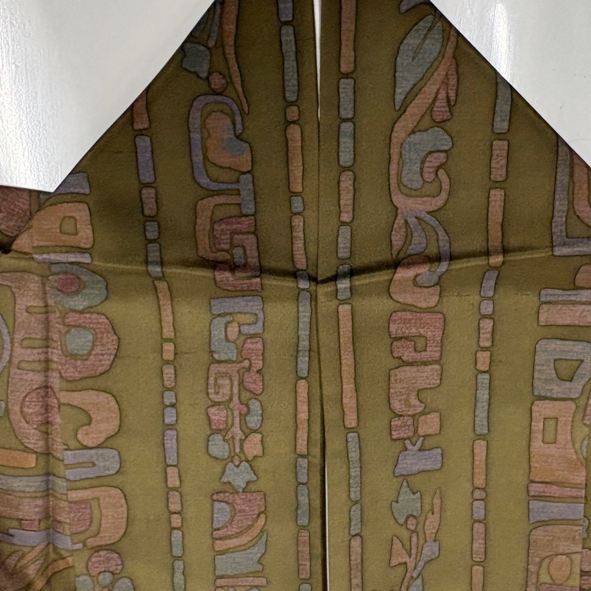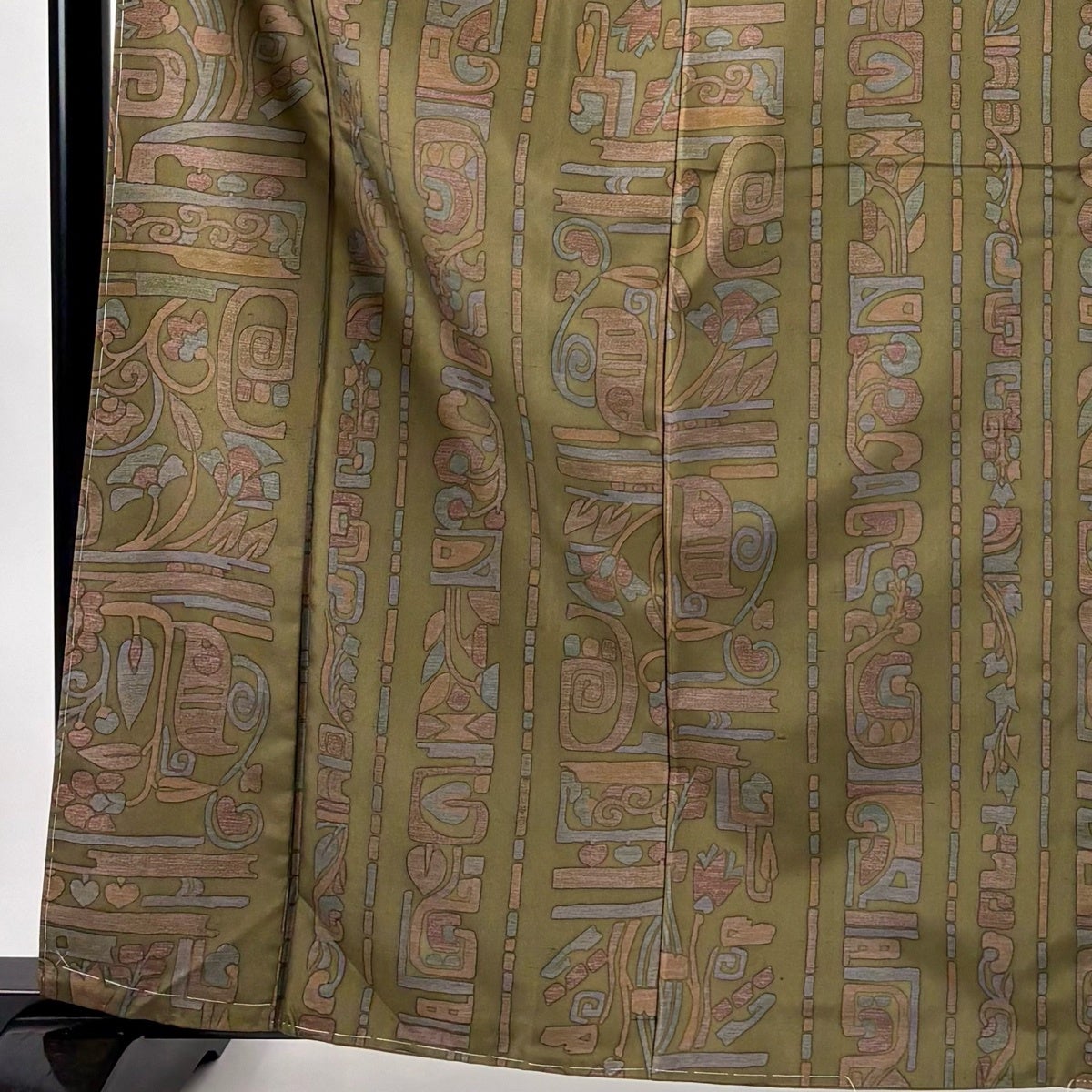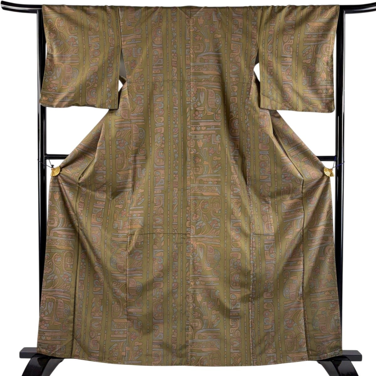 【美品】 小紋 身丈164cm 裄丈63.5cm S 袷 紬地 縞 幾何学模様 鶯色 正絹 秀品