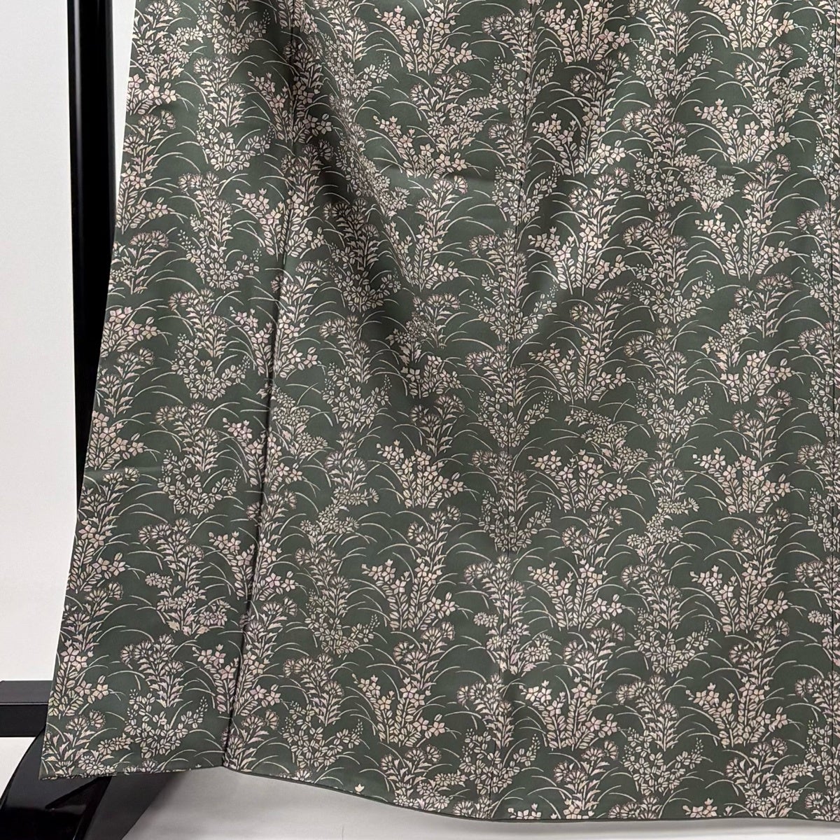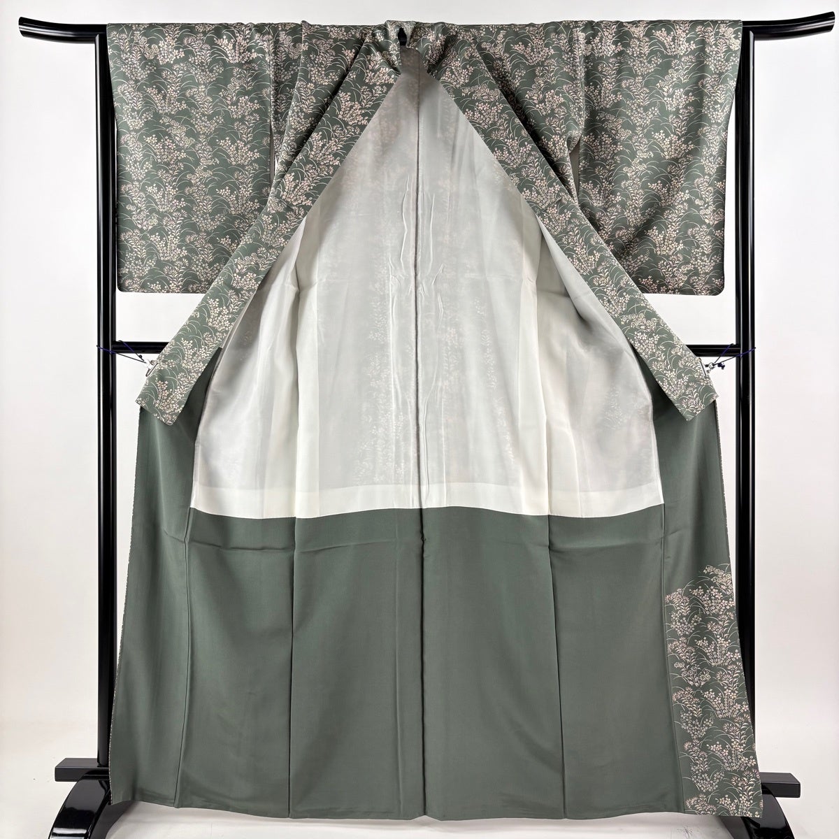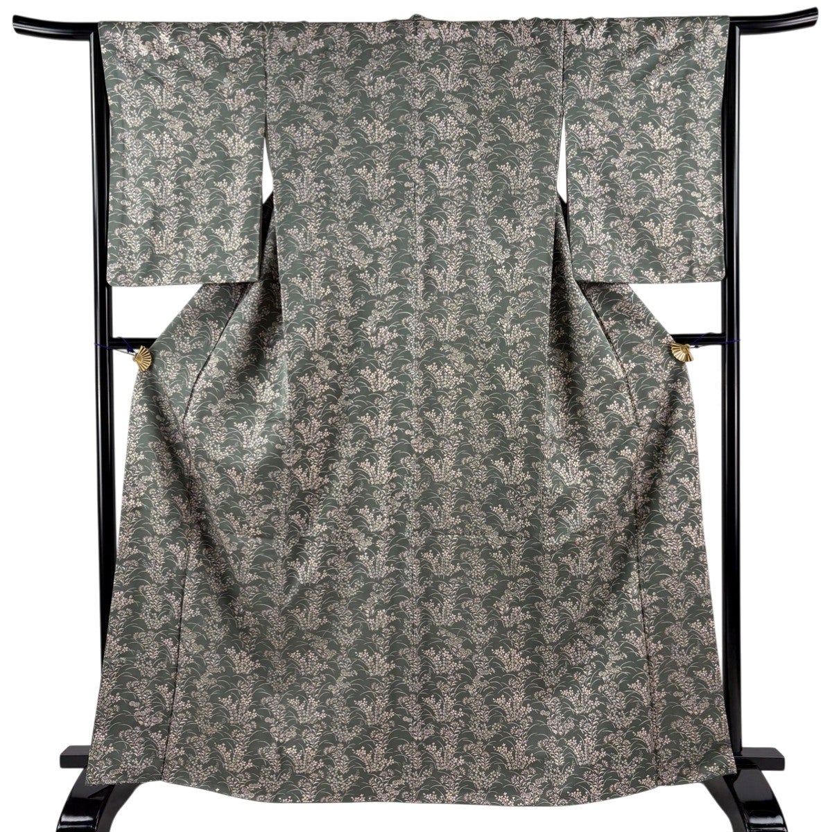 【美品】 小紋 身丈165.5cm 裄丈64.5cm M 袷 草花 萩 金彩 金通し 灰緑 正絹 秀品