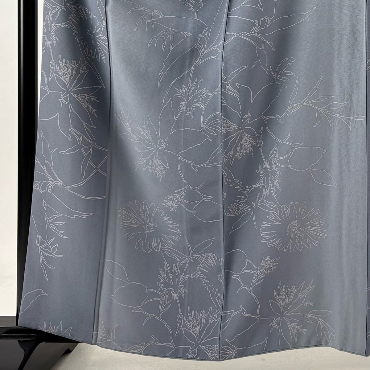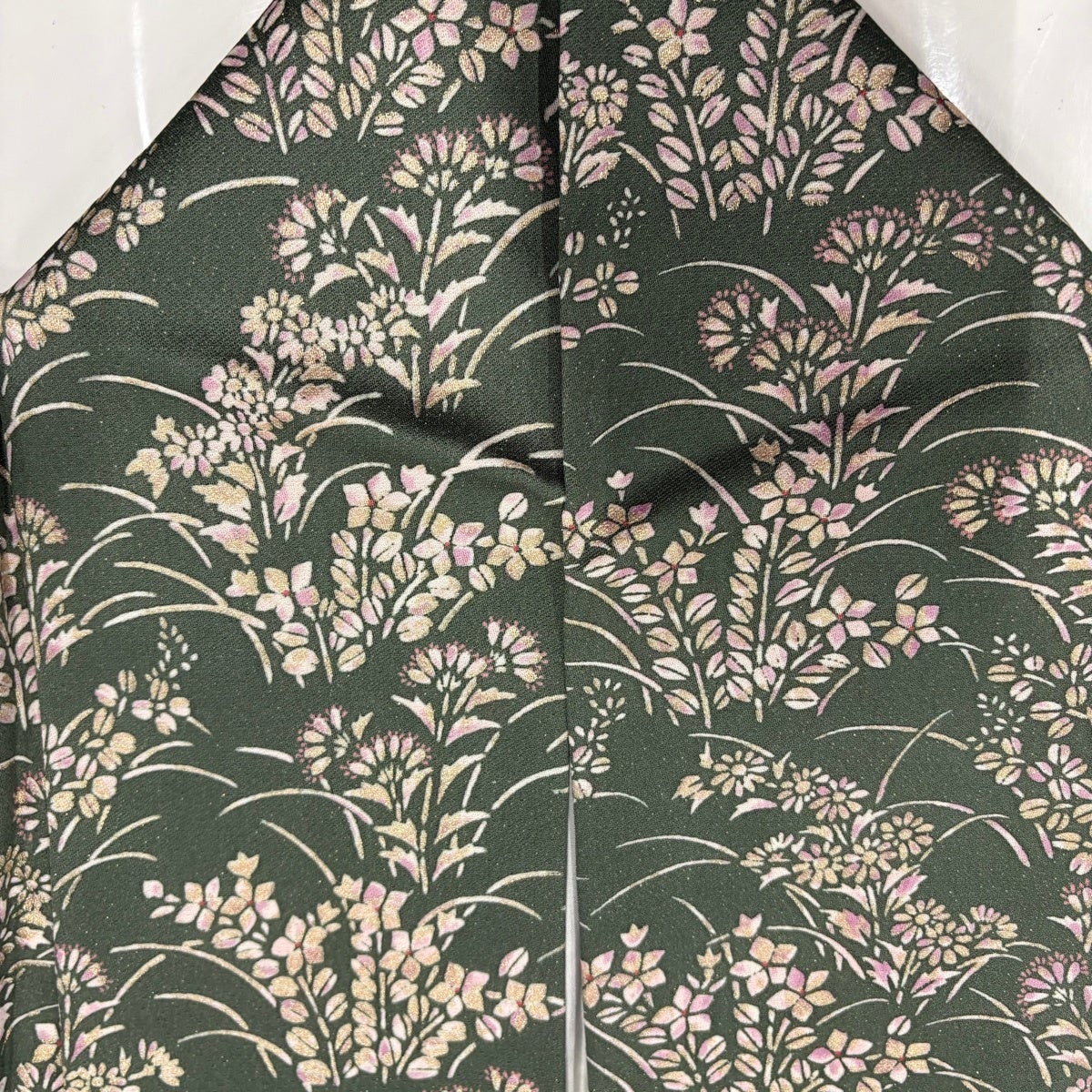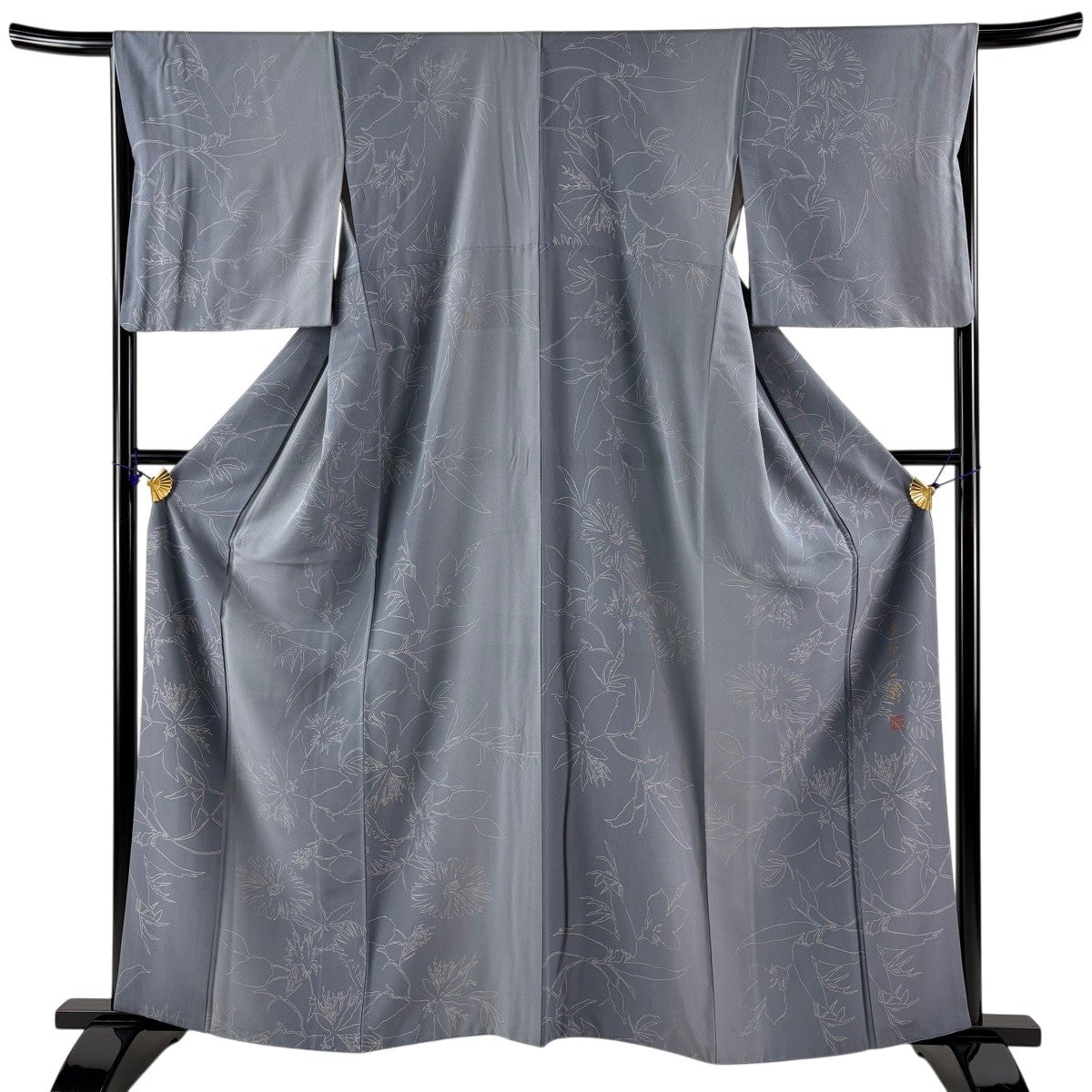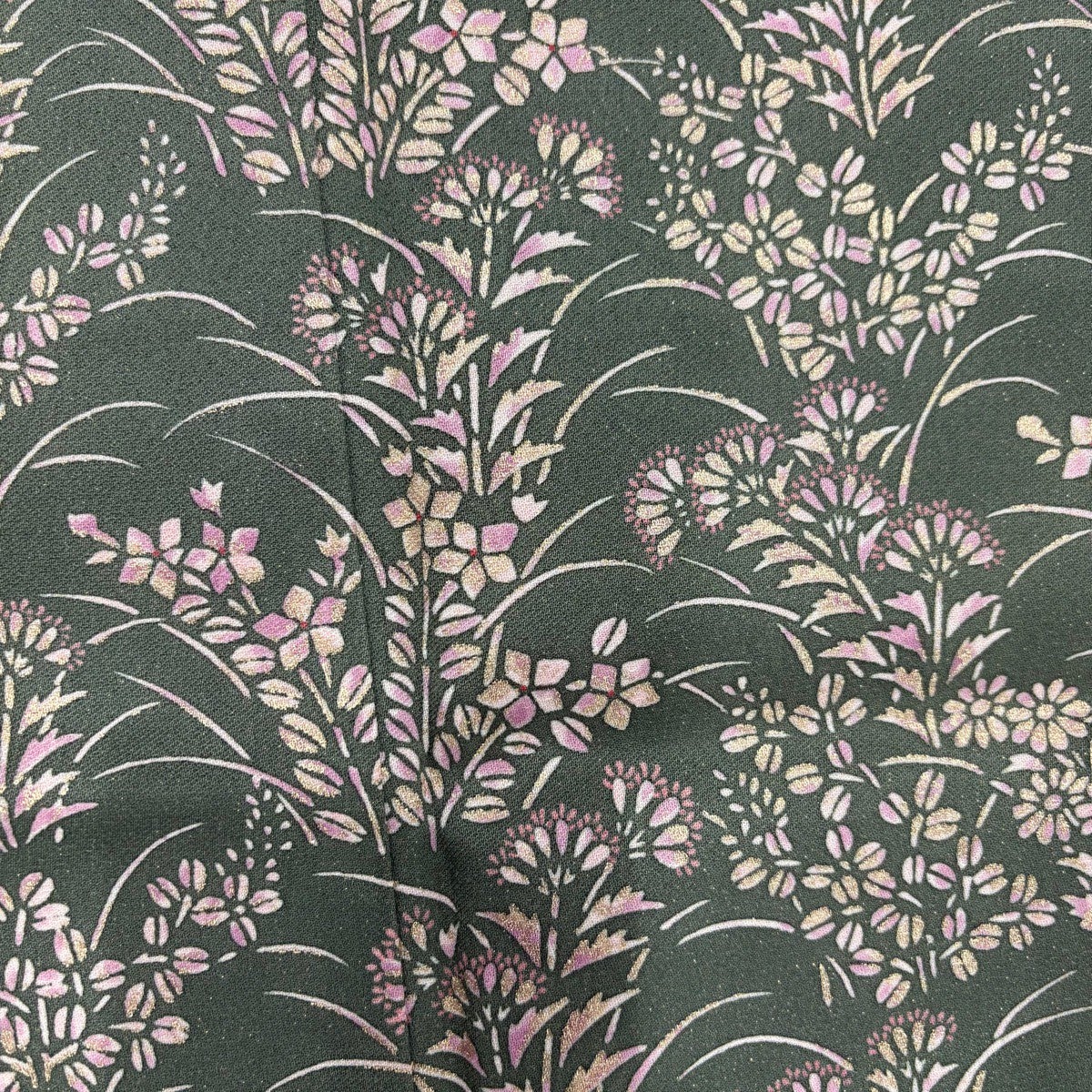 【美品】 小紋 身丈165.5cm 裄丈64.5cm M 袷 草花 萩 金彩 金通し 灰緑 正絹 秀品