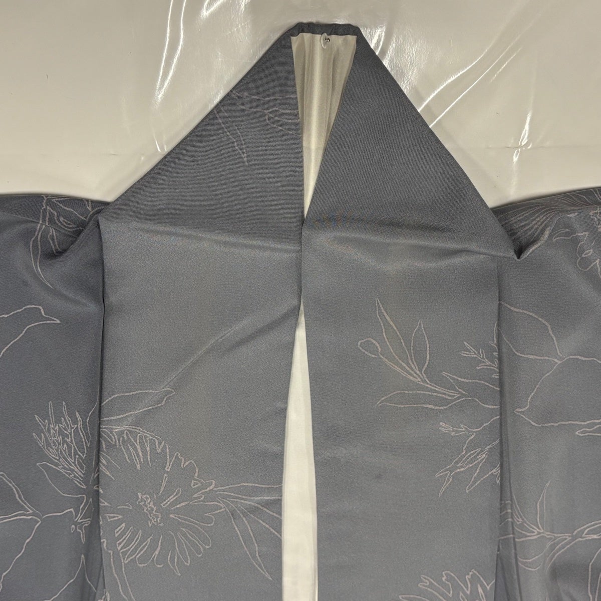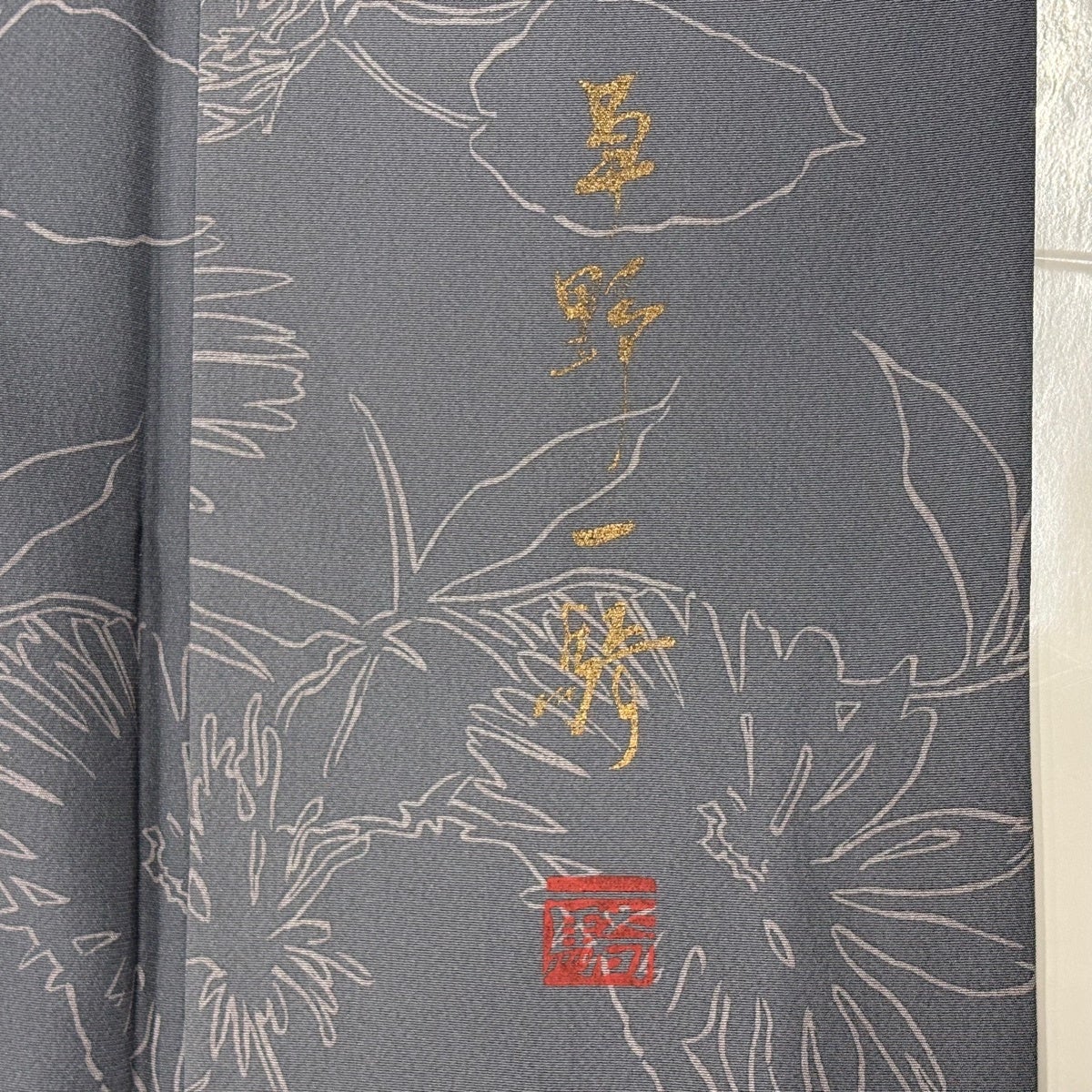 小紋 身丈161cm 裄丈62cm S 袷 南部幸雄 落款あり 鳥 松梅 縮緬 灰色 正絹 秀品