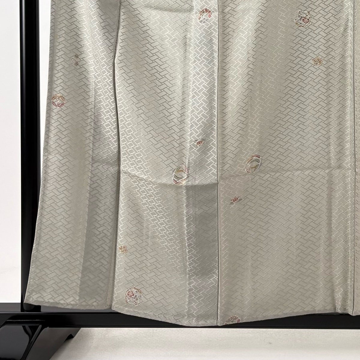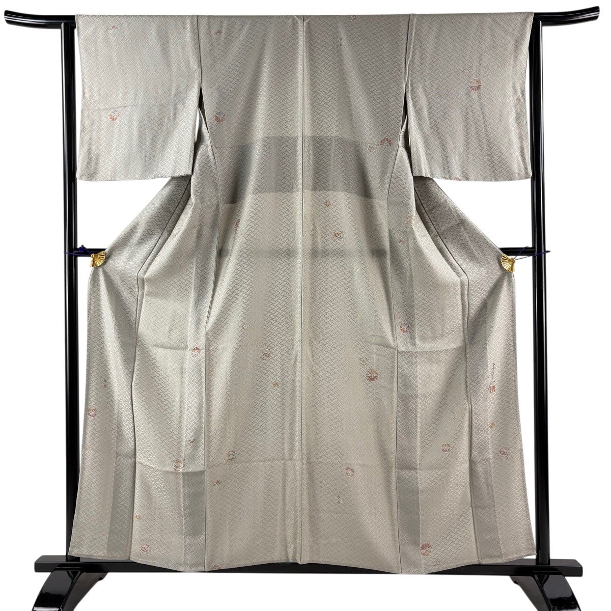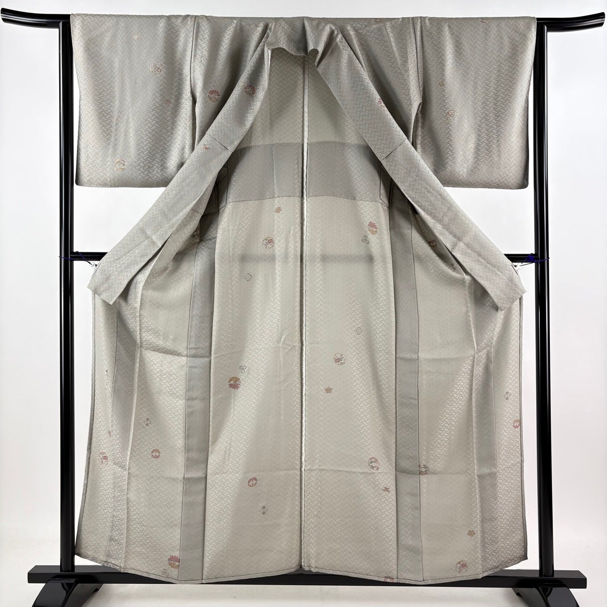 【美品】 小紋 身丈165cm 裄丈65cm M 袷 山岡古都 落款あり 草花 菱 紋意匠 灰色 正絹 逸品