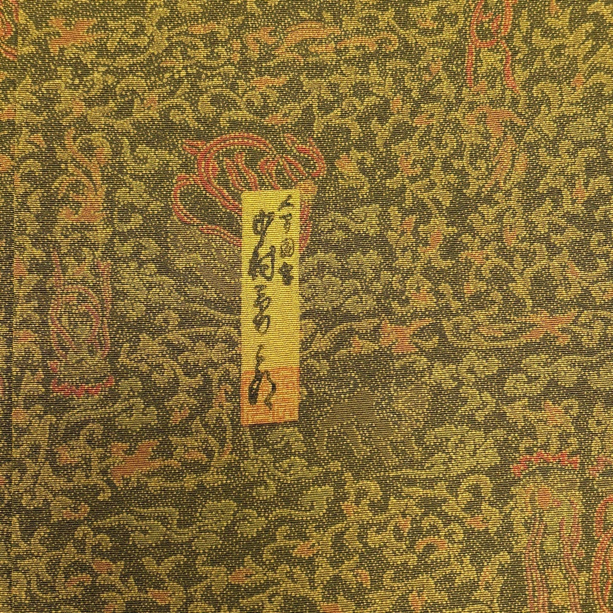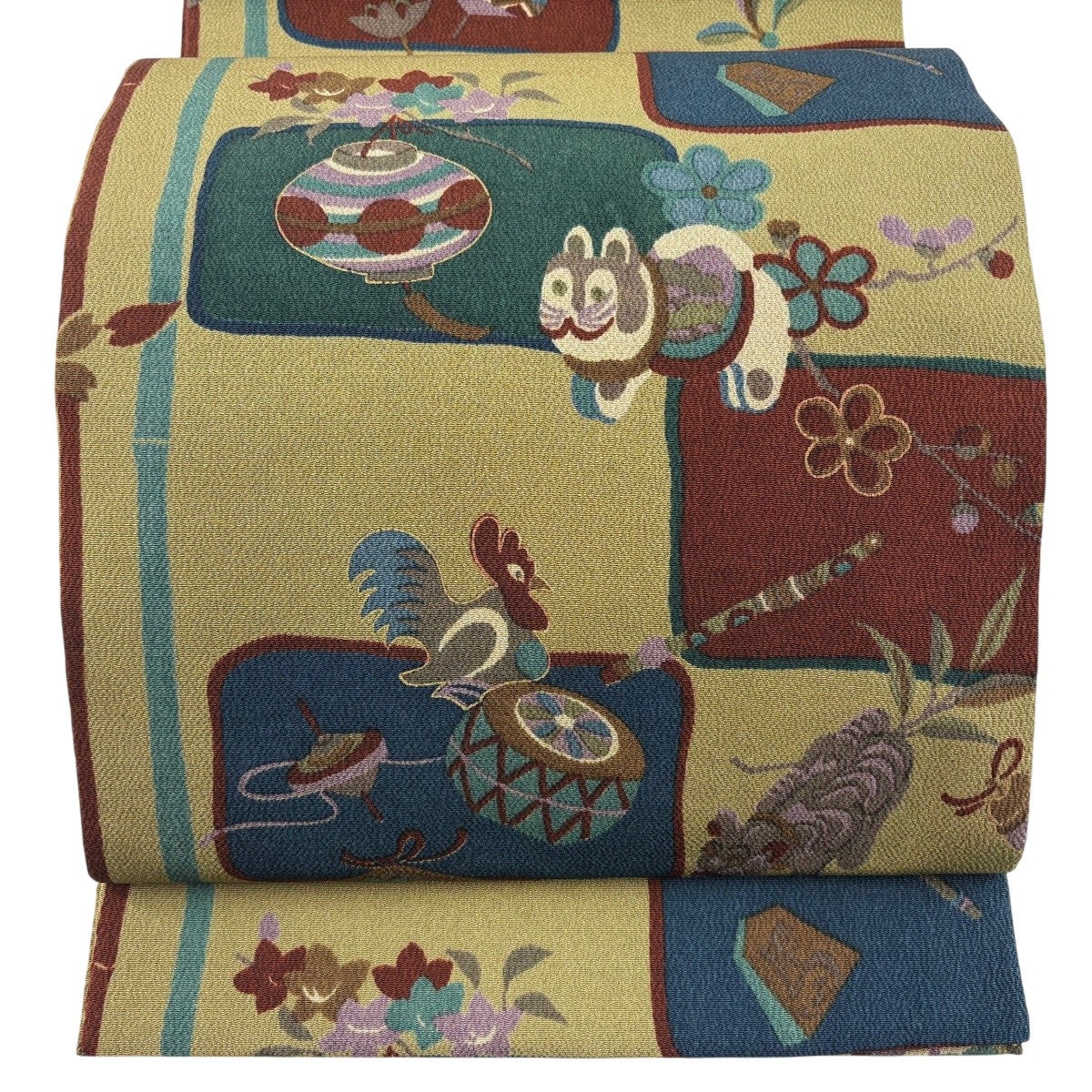 開き名古屋帯 秀品 玩具 枝梅 金彩 縮緬 茶緑色 正絹