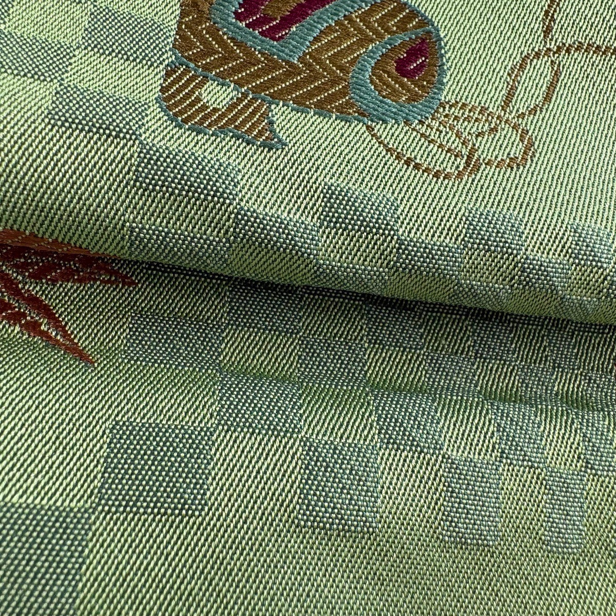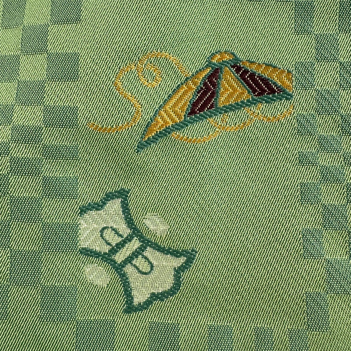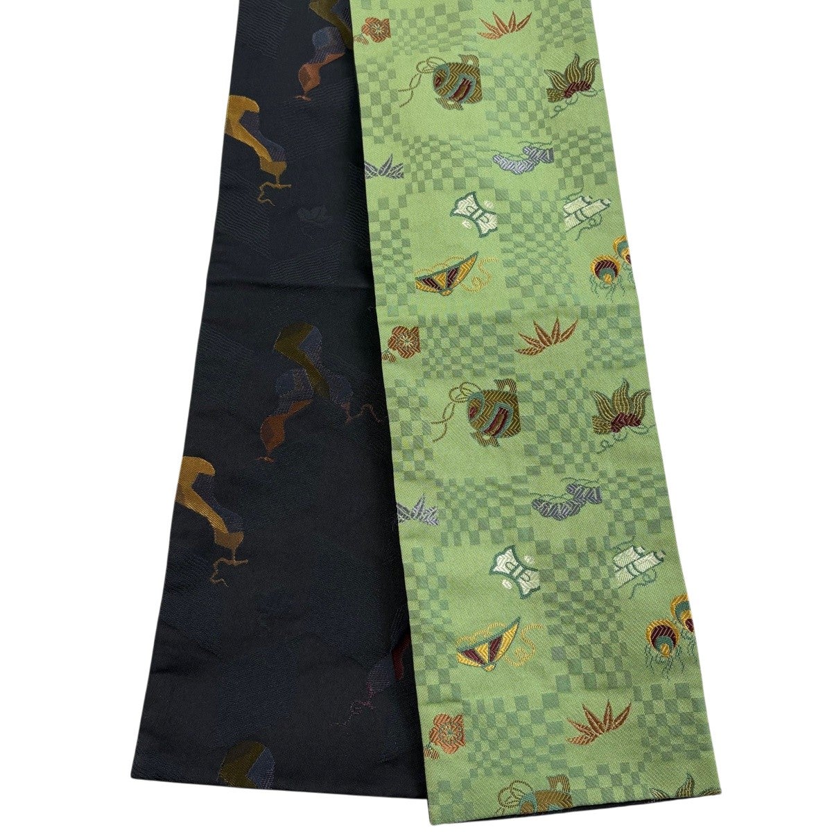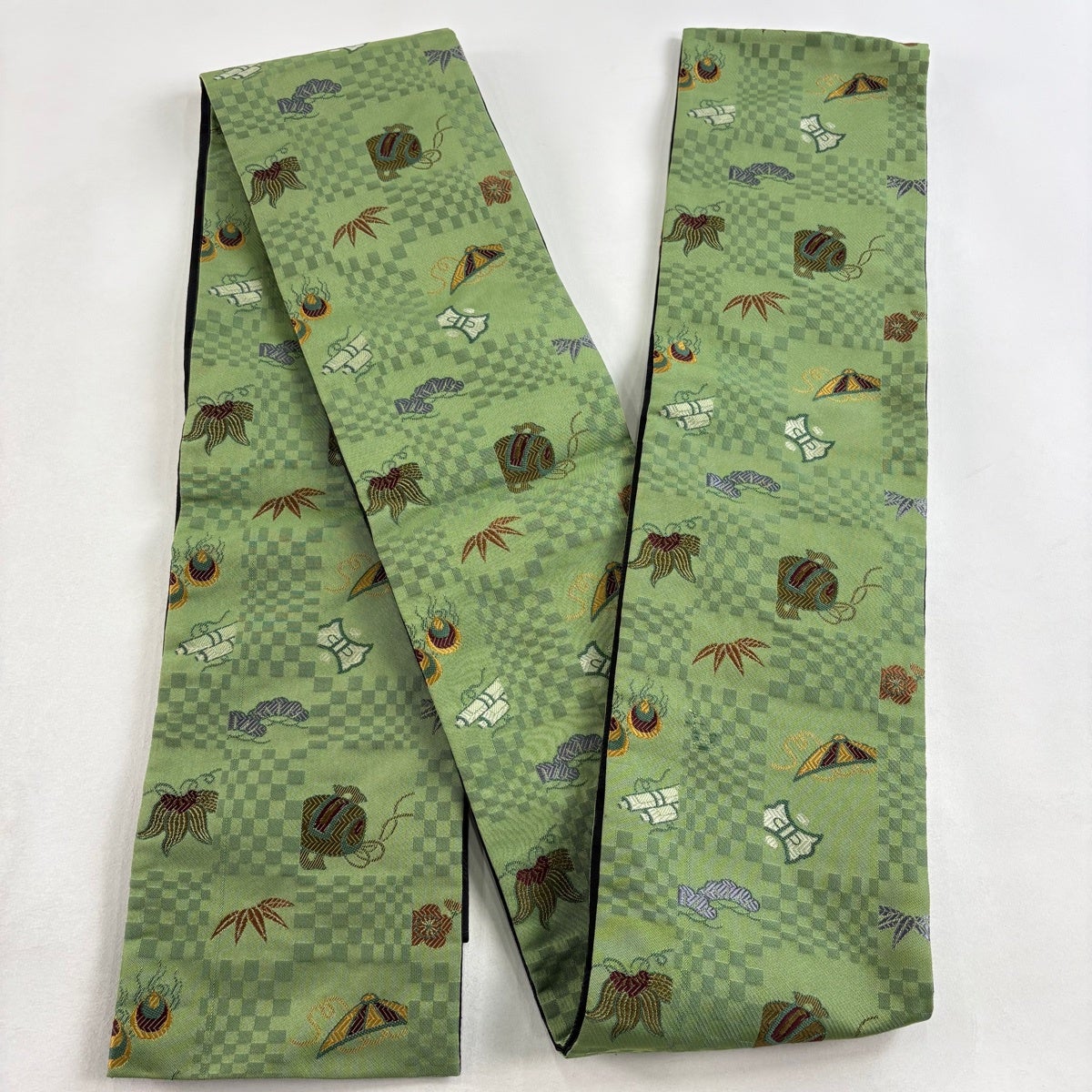 半幅帯 優品 宝尽くし 松竹梅 薄緑 化繊