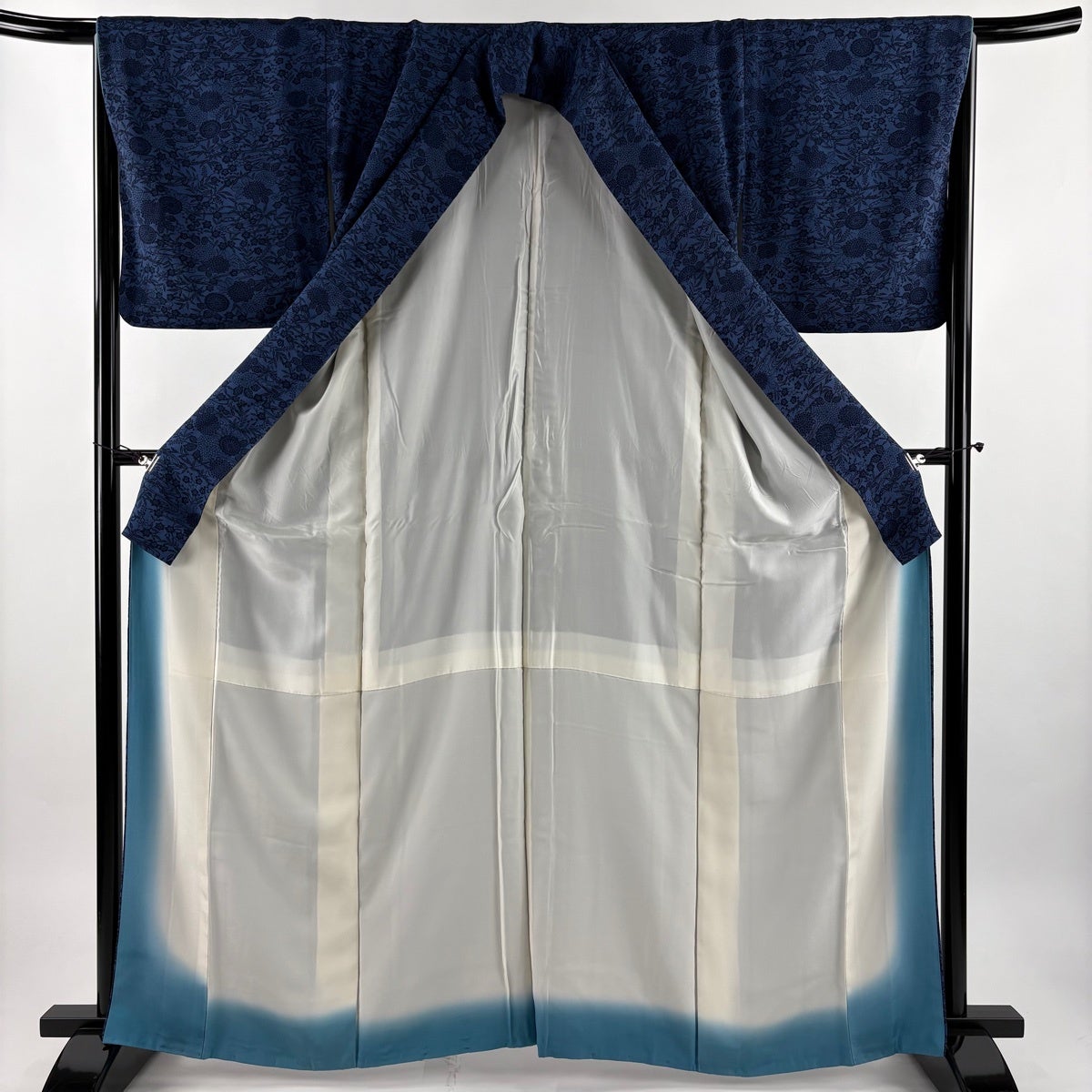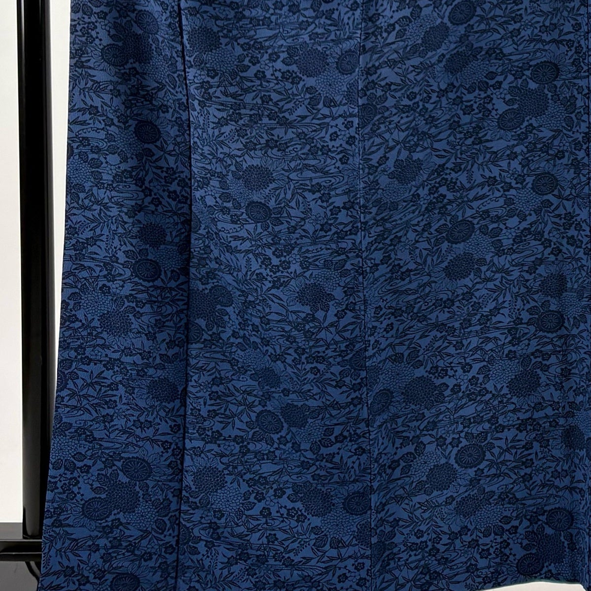 小紋 身丈156cm 裄丈62cm S 袷 花 葉柄 絞り 紺色 正絹 名品
