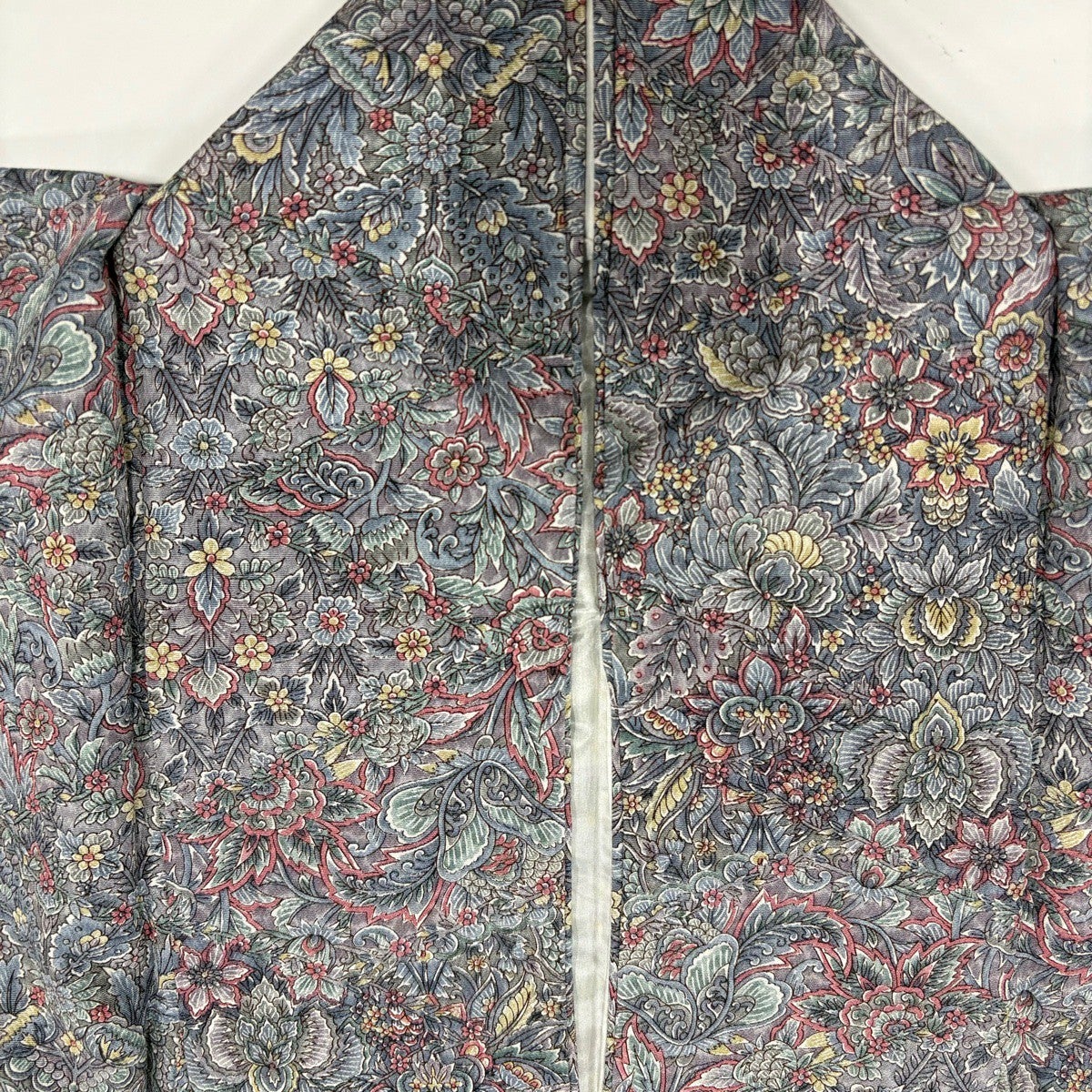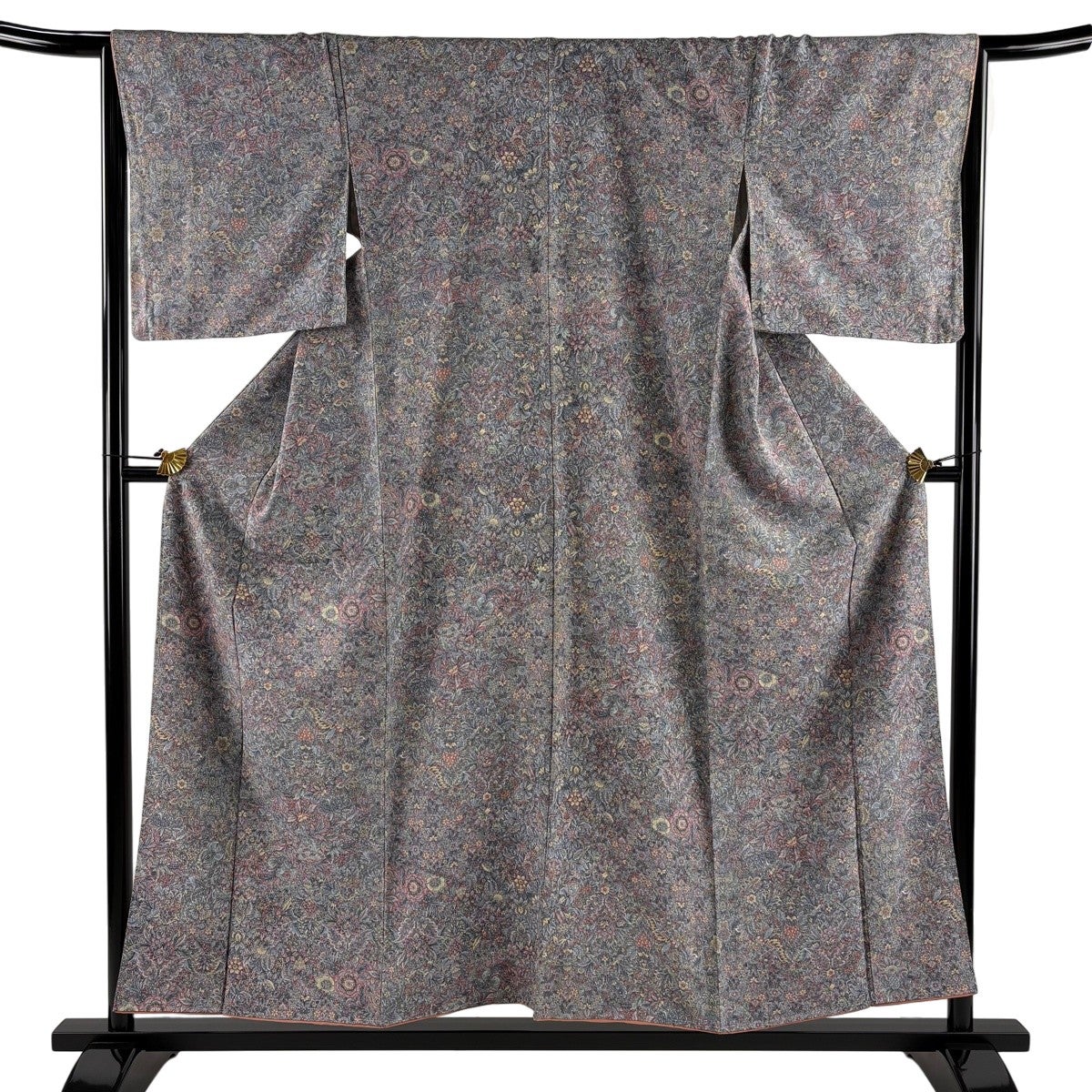 小紋 身丈158.5cm 裄丈66.5cm M 袷 草花 縮緬 灰緑 正絹 秀品