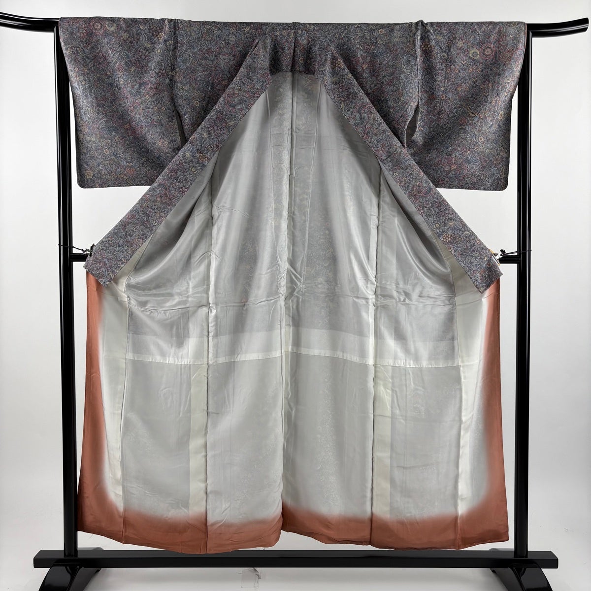 小紋 身丈156.5cm 裄丈61.5cm S 袷 草花 絞り 黒灰 正絹 秀品