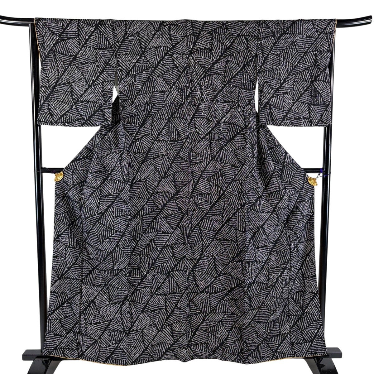 小紋 身丈167.5cm 裄丈64cm M 袷 幾何学 絞り 黒 正絹 秀品