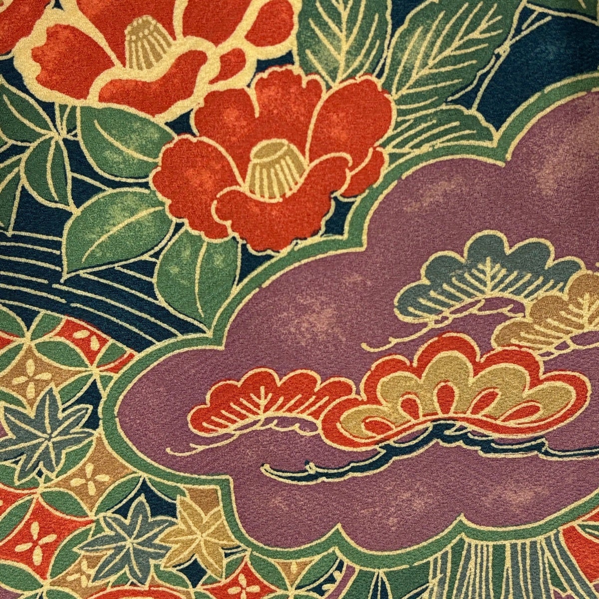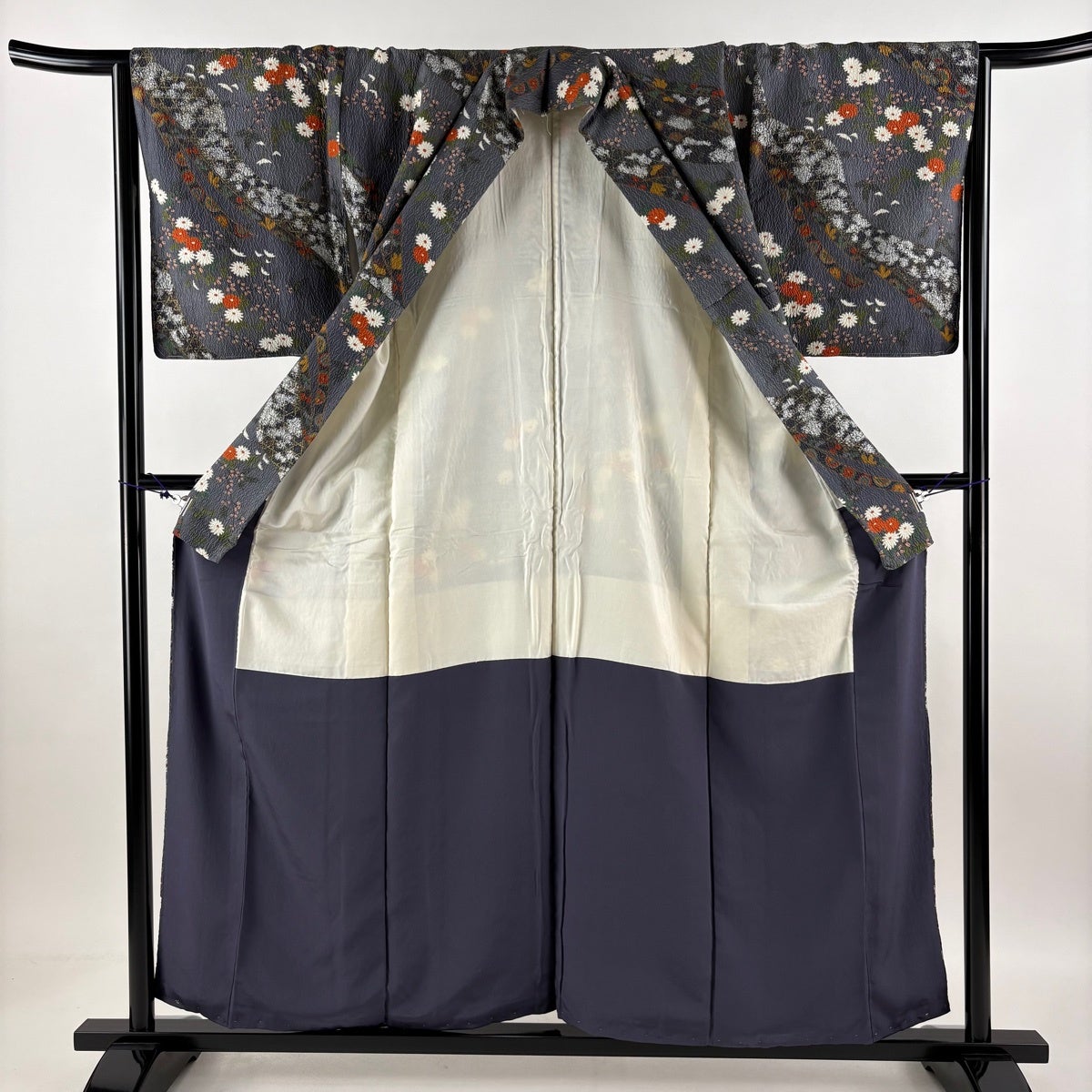 小紋 身丈162cm 裄丈65cm M 袷 色紙 草花 金彩 紺色 正絹 優品