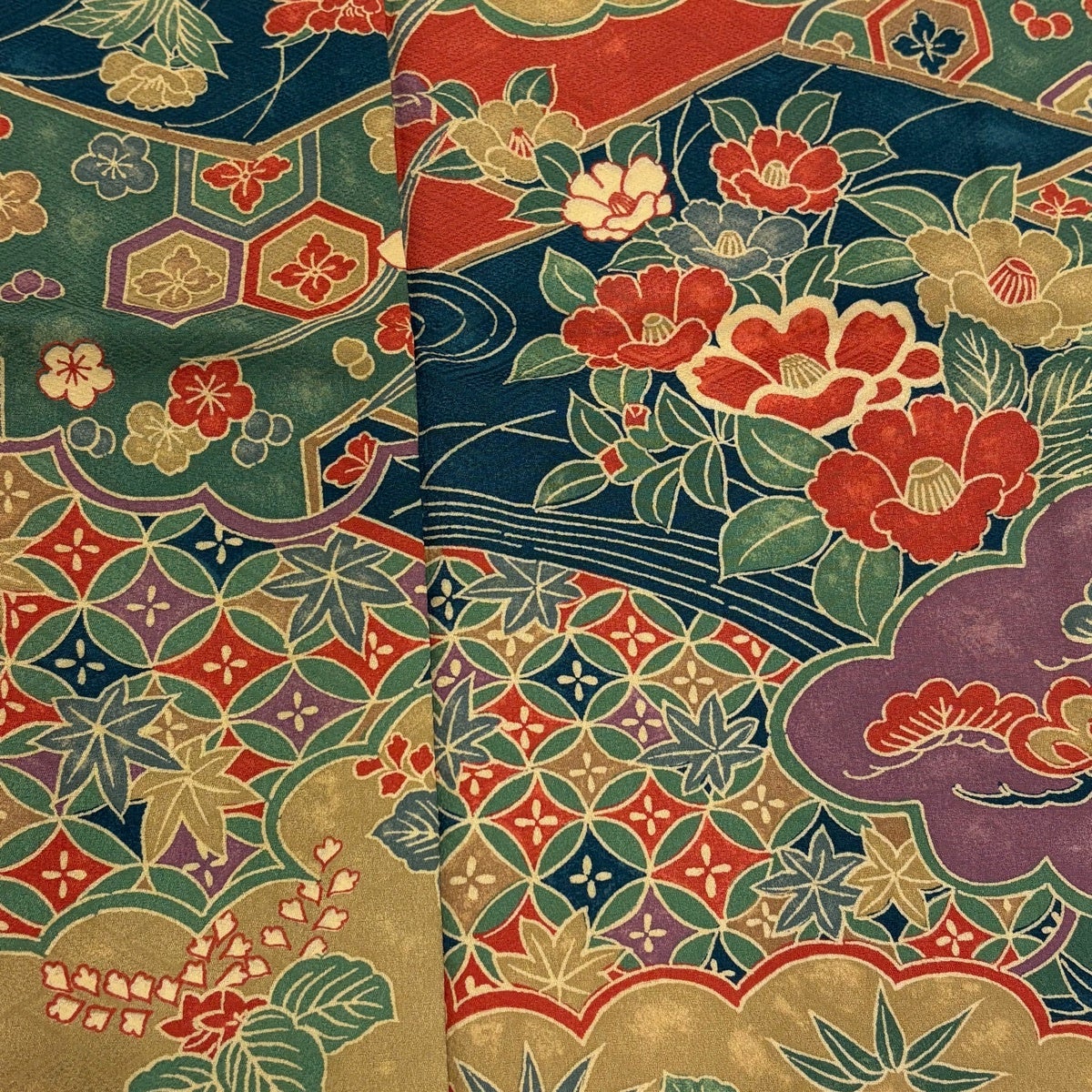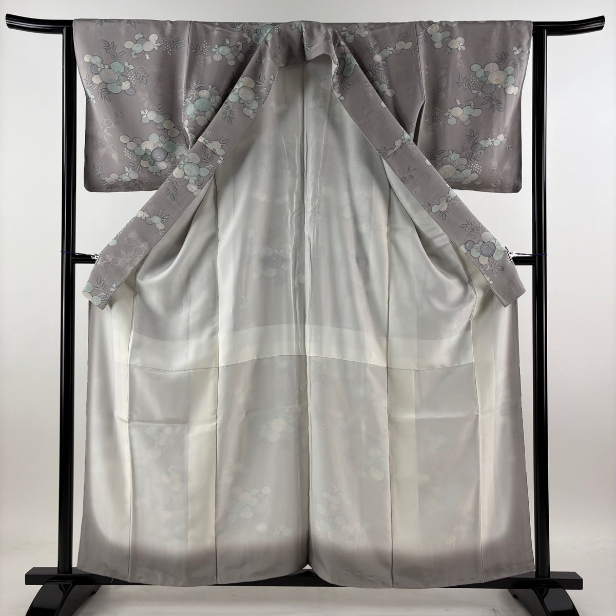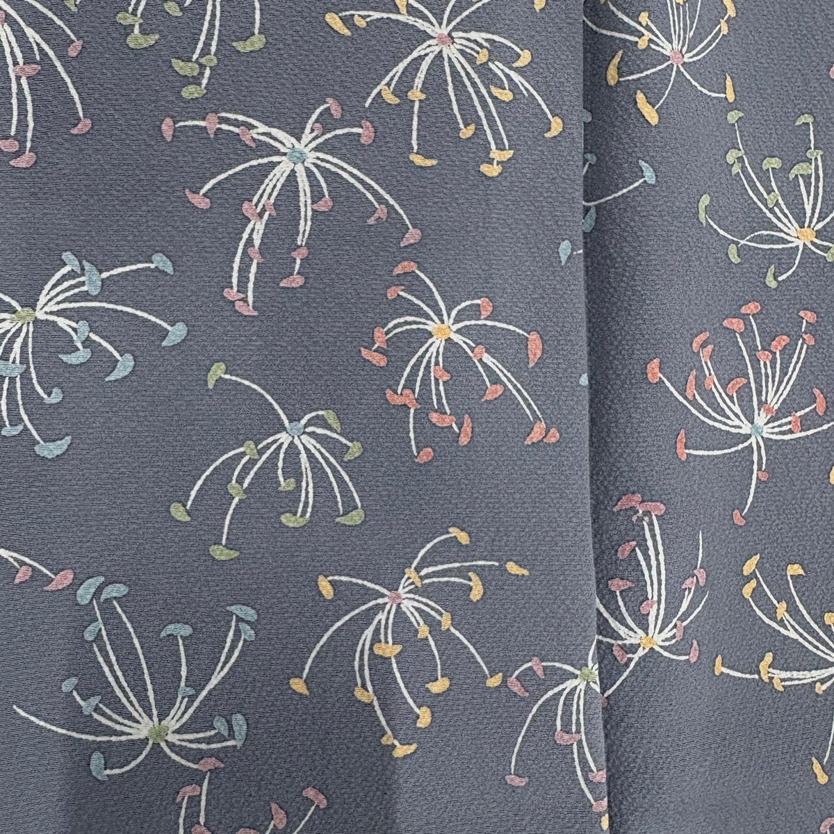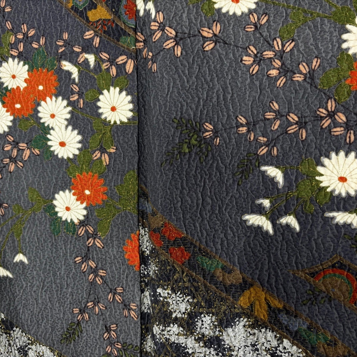 小紋 身丈155cm 裄丈63.5cm S 袷 楓 花 縮緬 青灰色 正絹 秀品