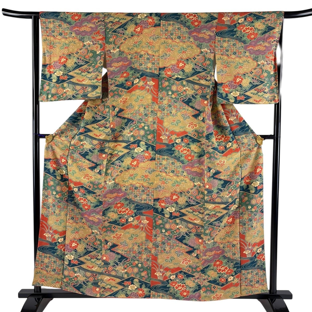 小紋 身丈159.5cm 裄丈62.5cm S 袷 辻が花柄 金彩 黒 正絹 秀品