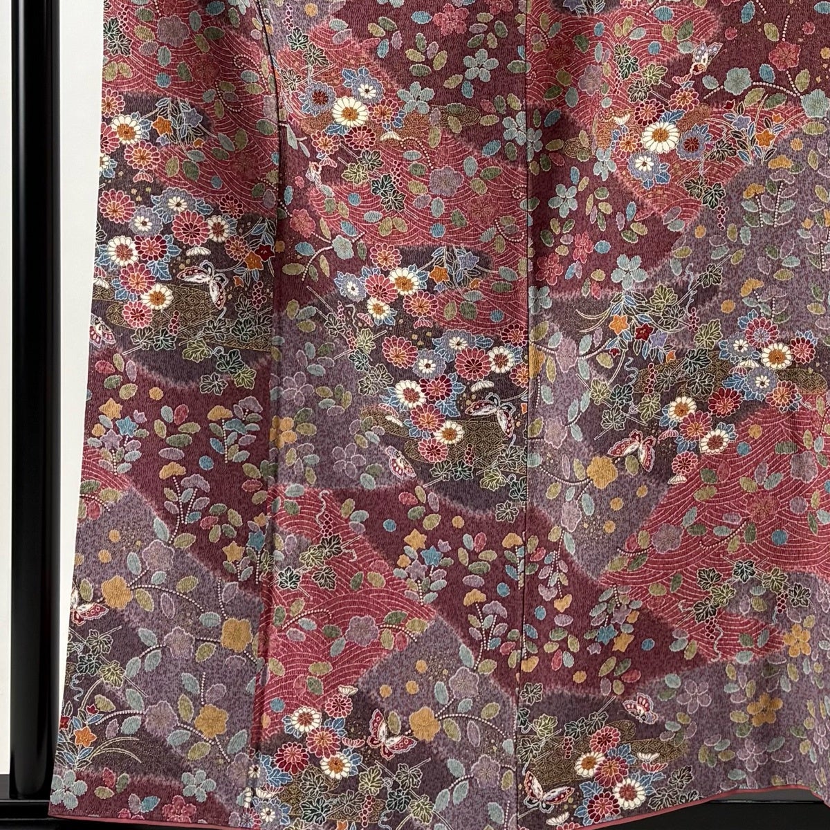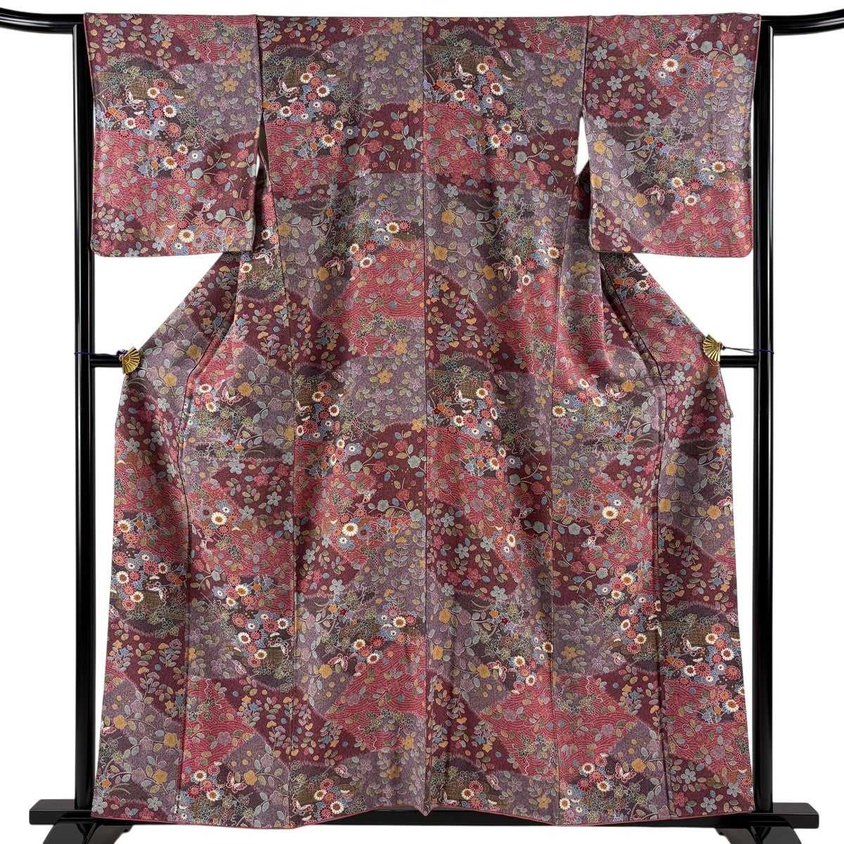 小紋 身丈161.5cm 裄丈66.5cm M 袷 扇 菊 縮緬 赤茶 正絹 優品