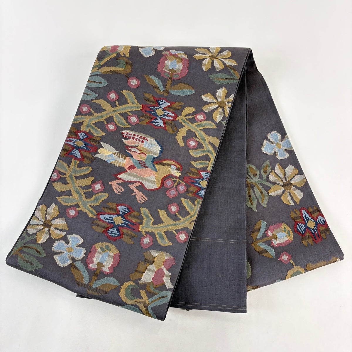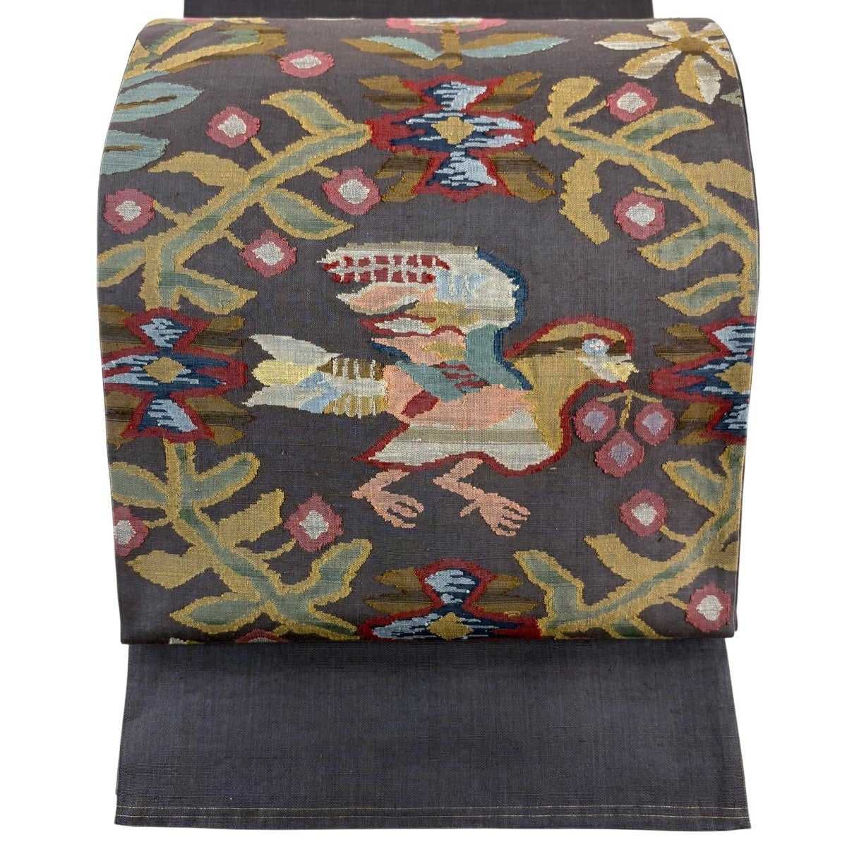 70%OFF 【美品】 袋帯 名品 狩猟文 草花 灰色 お太鼓柄 正絹 K70