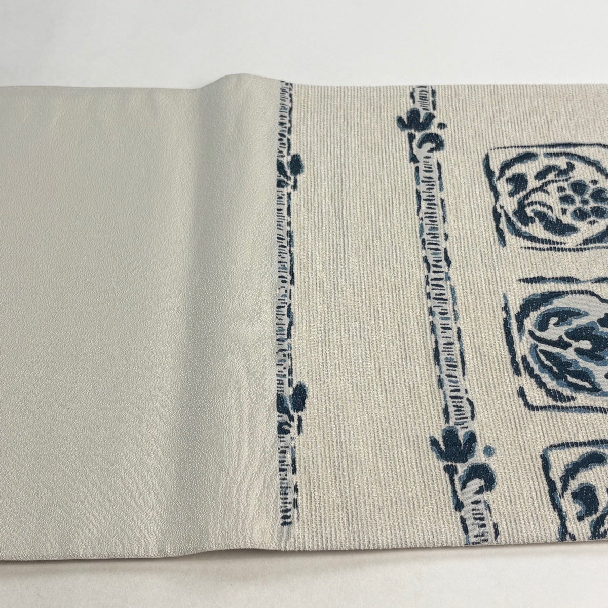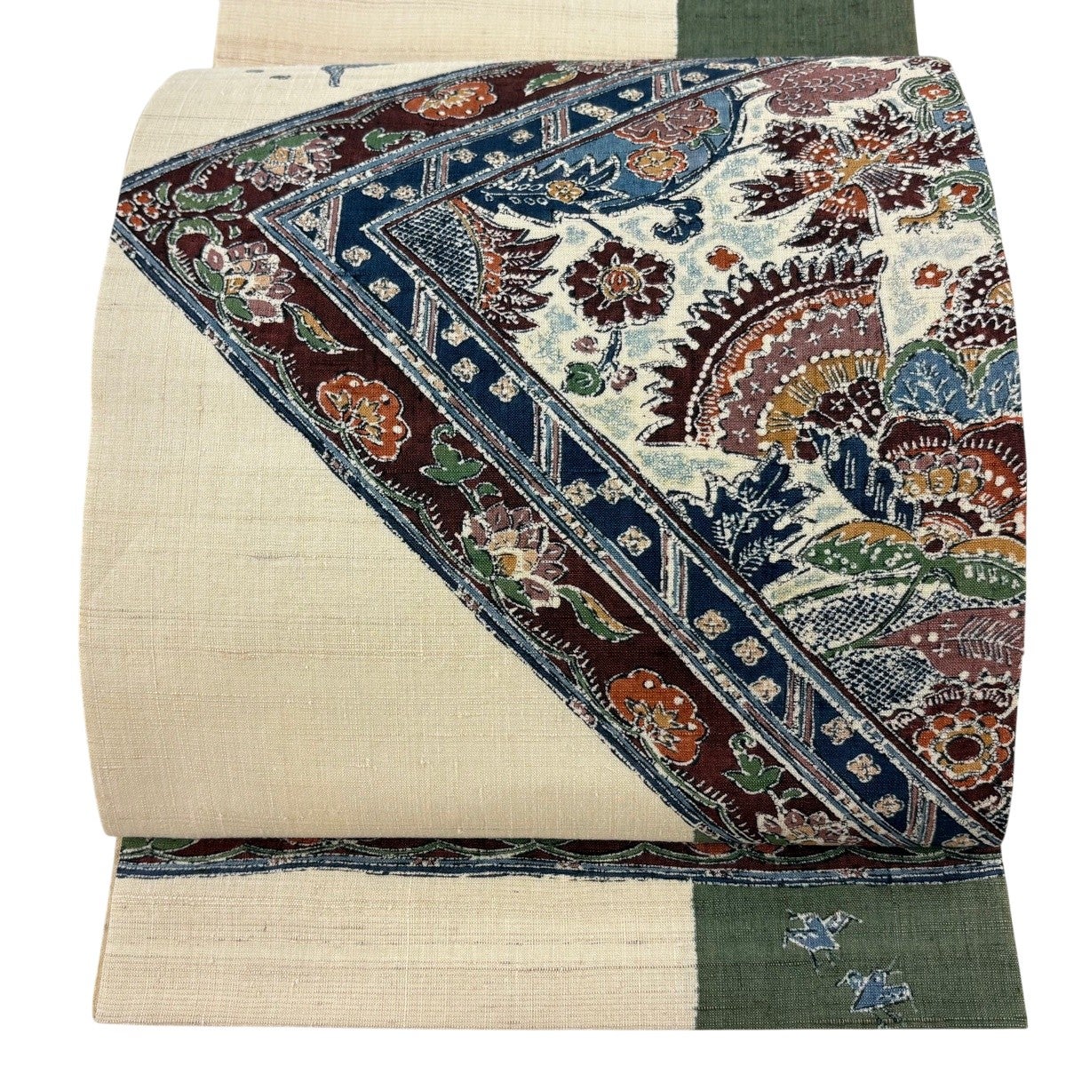 名古屋帯 秀品 草花 流水 縮緬 ベージュ 正絹