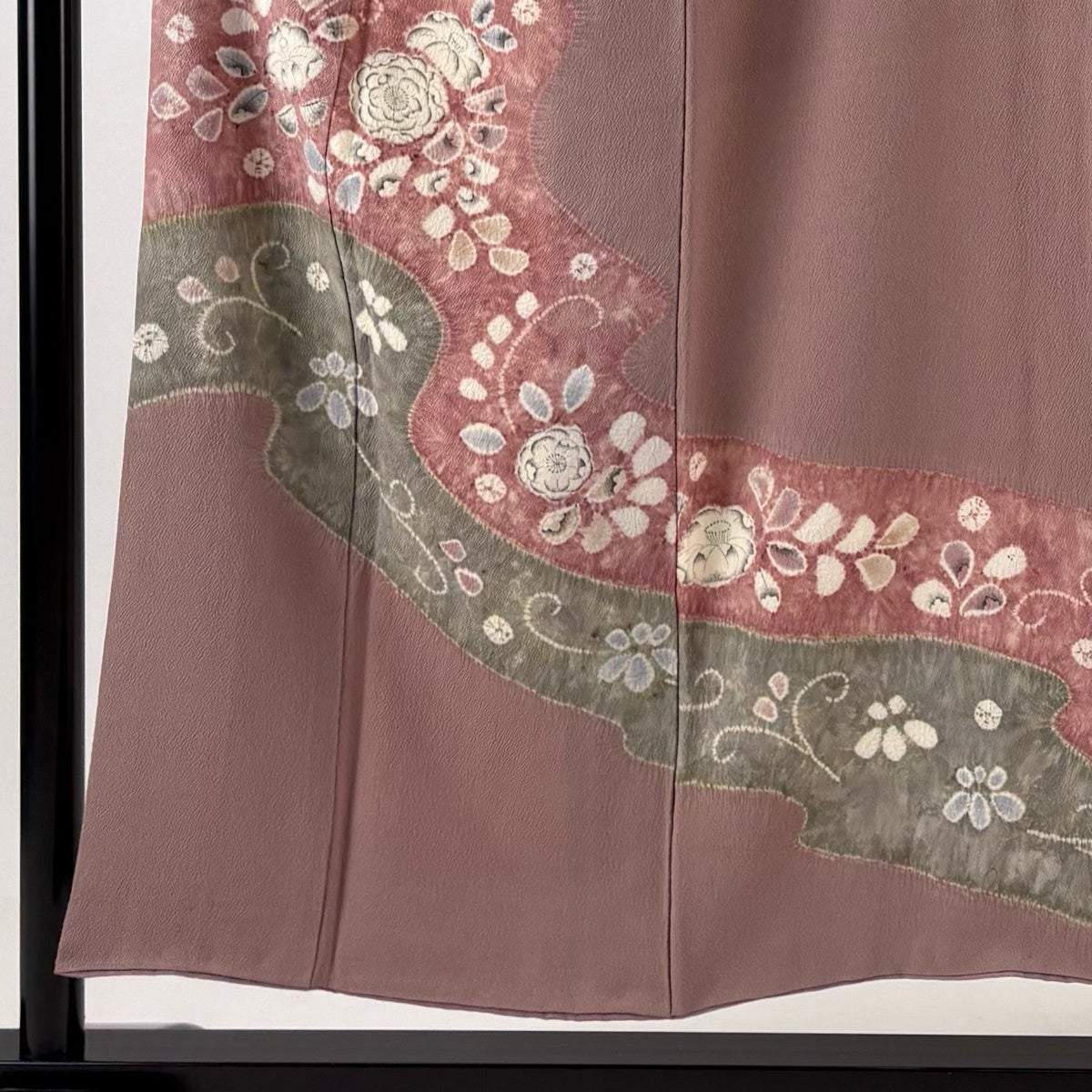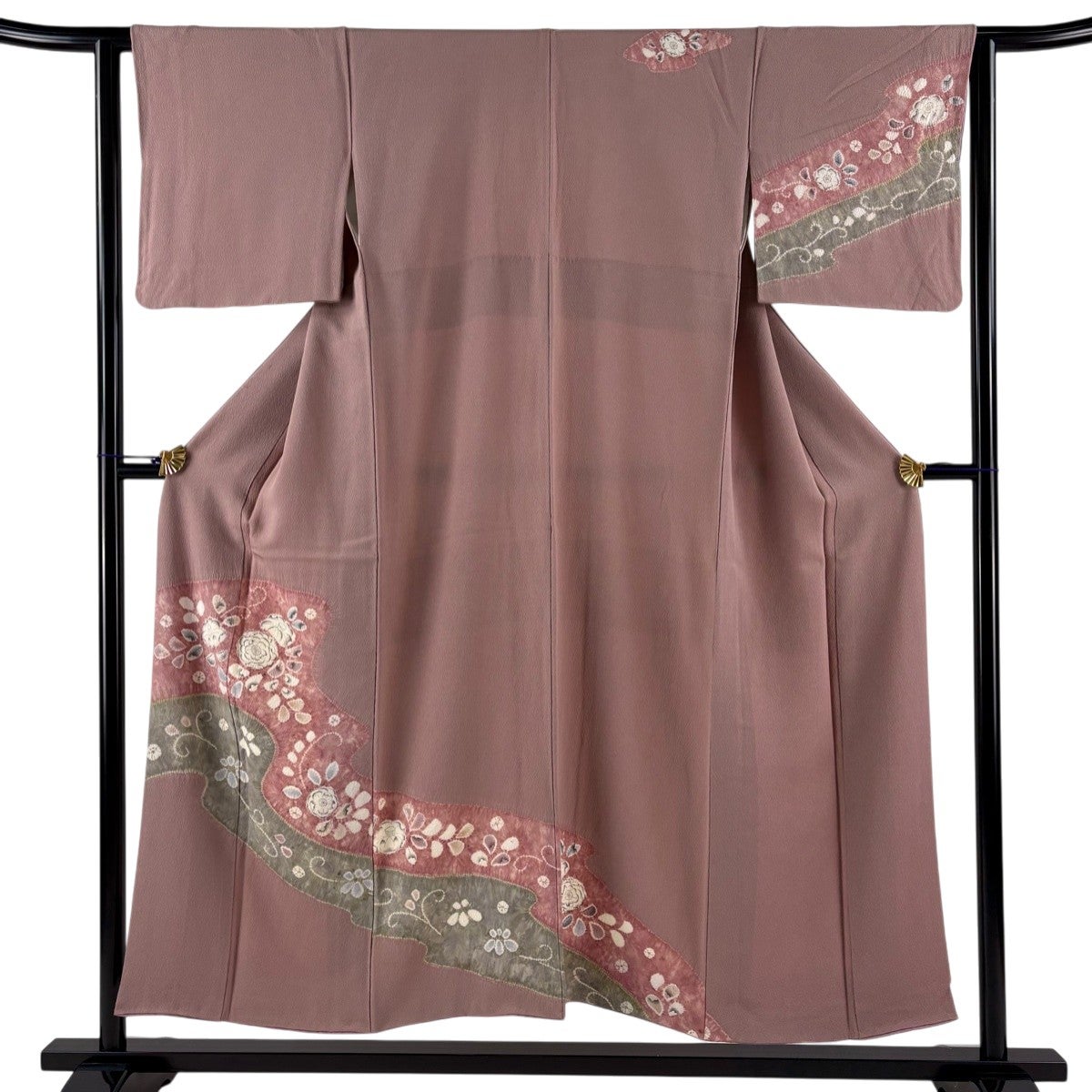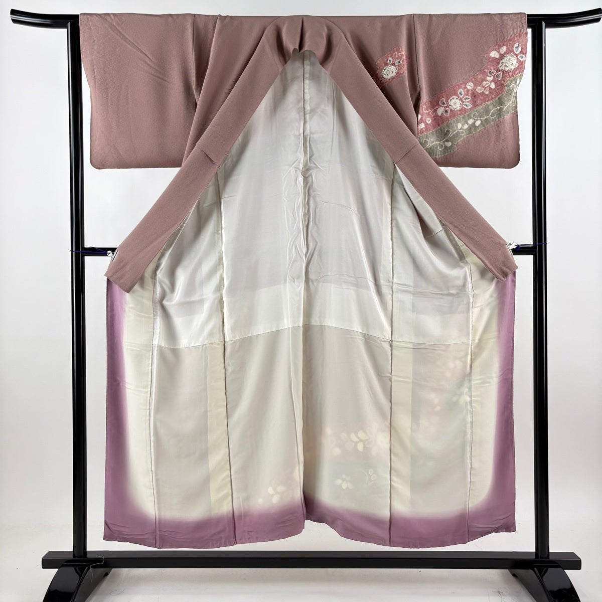 付下げ 身丈164.5cm 裄丈67cm M 袷 草花 刺繍 ぼかし 小豆色 正絹 秀品