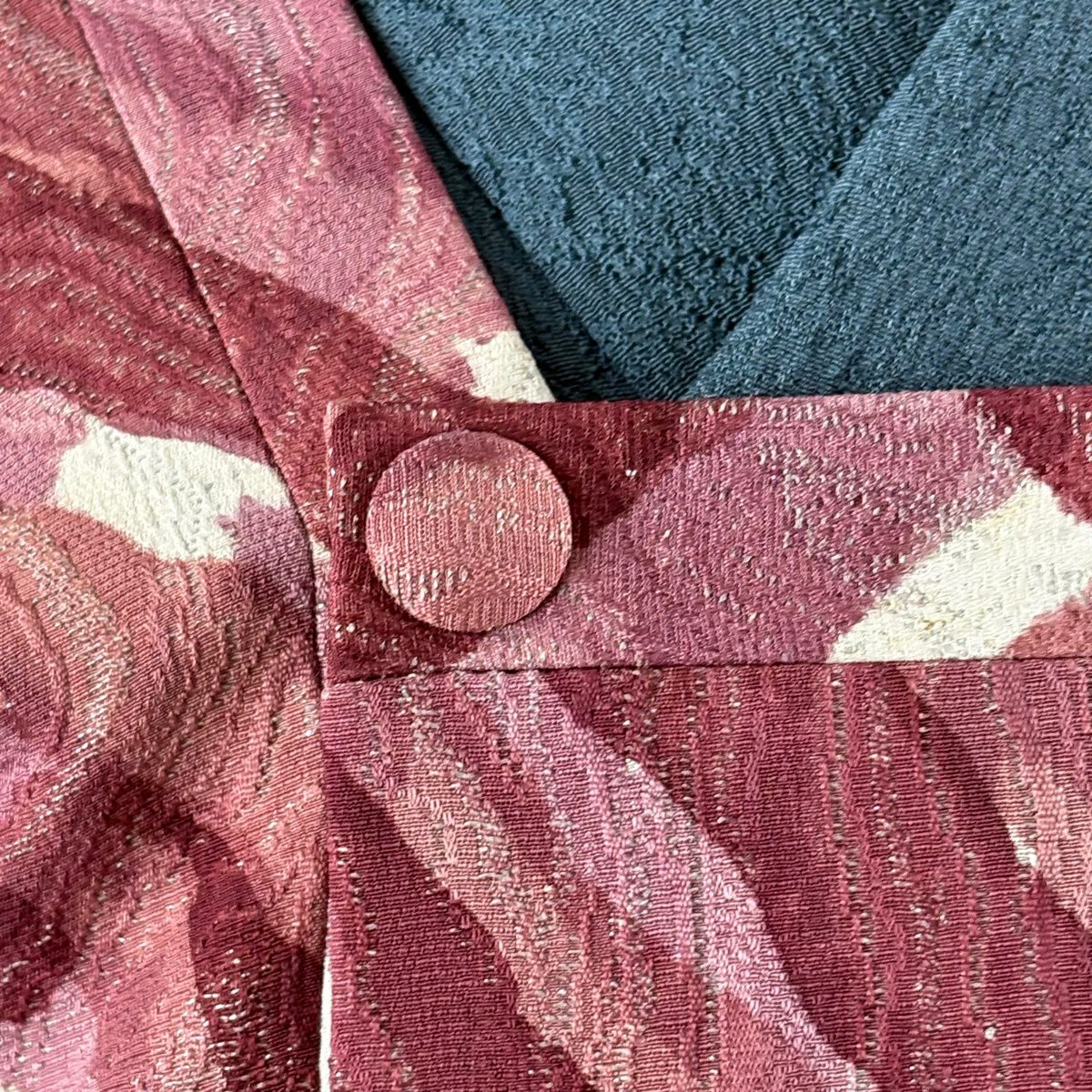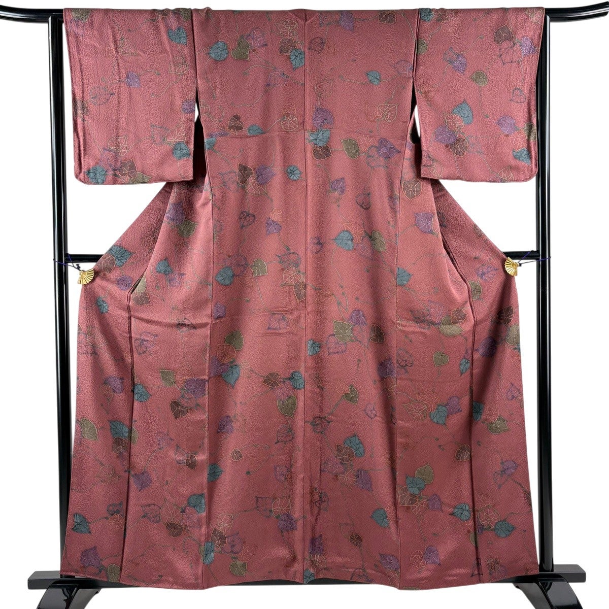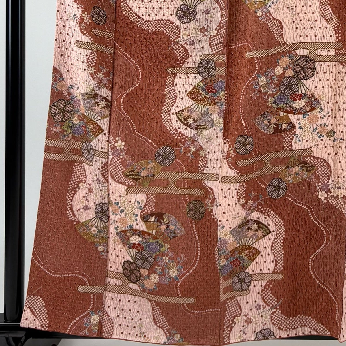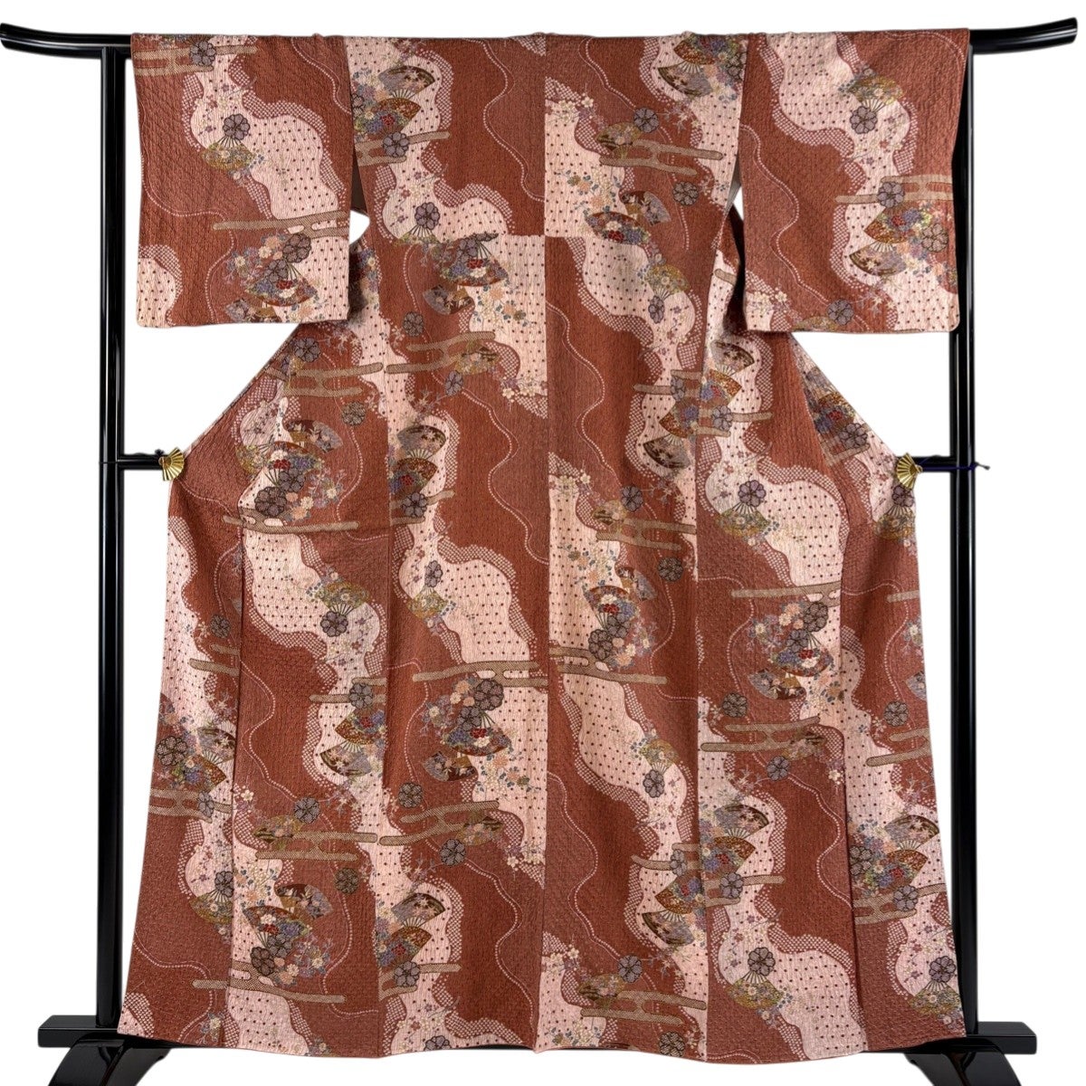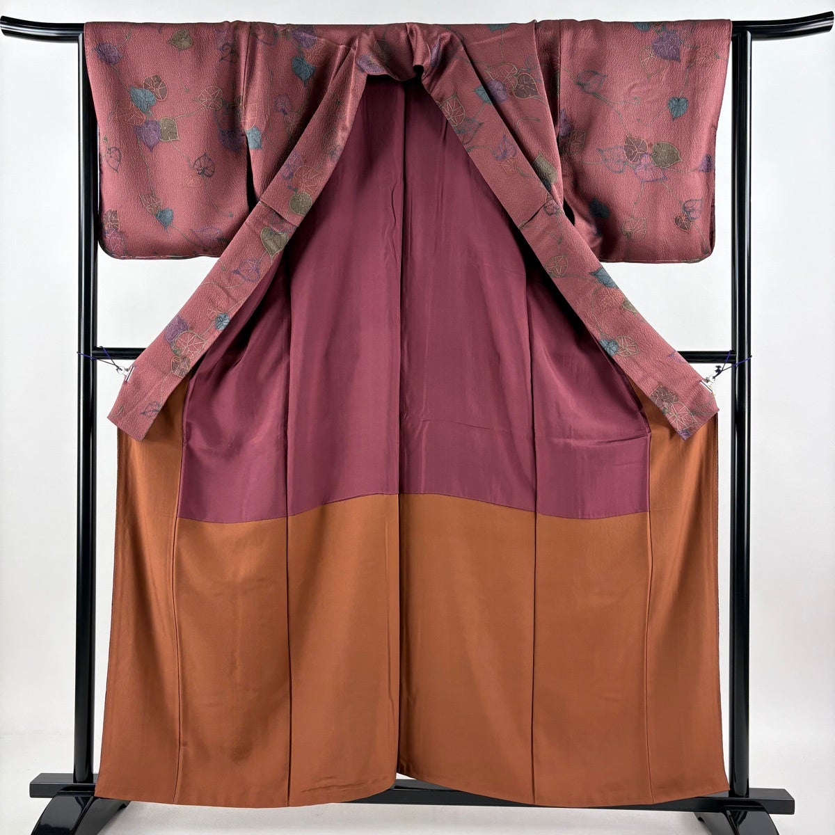 小紋 身丈162cm 裄丈63.5cm S 袷 洗える着物 草花 籠目 ぼかし 小豆色 化繊 優品