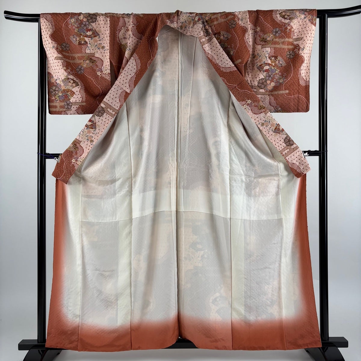 付下げ 身丈162.5cm 裄丈65cm M 袷 扇面 草花 刺繍 金銀彩 小豆色 正絹 優品