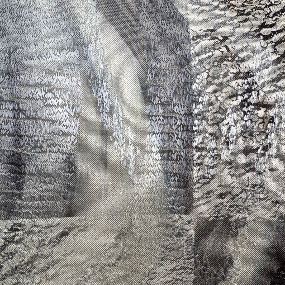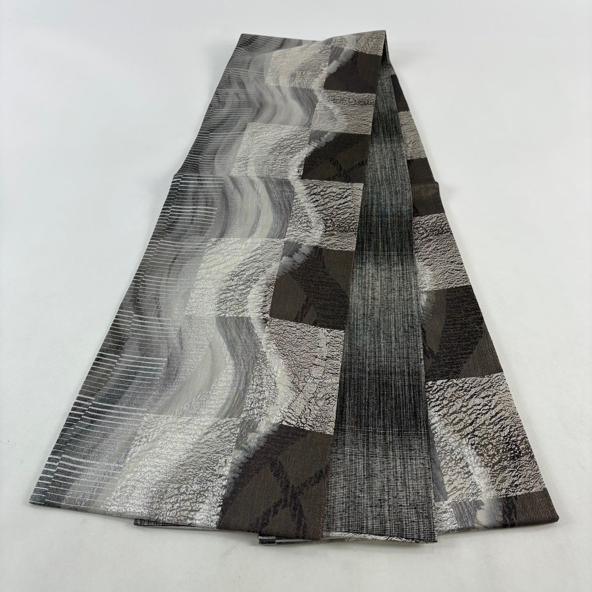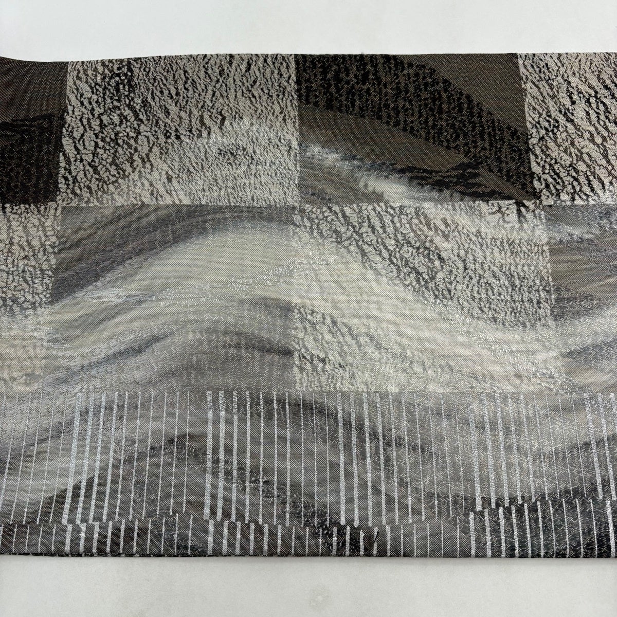 【美品】 袋帯 秀品 関西仕立て 文字文 市松 銀糸 箔 灰色 六通 正絹