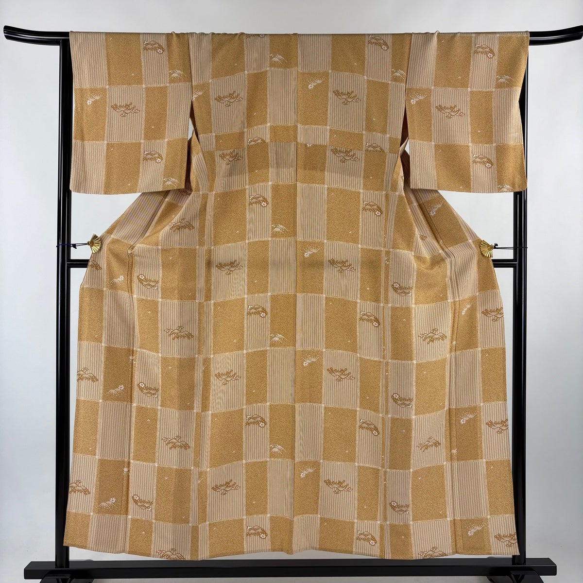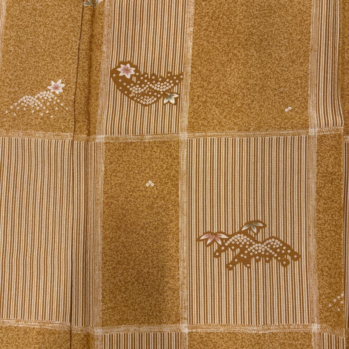 小紋 身丈153.5cm 裄丈66.5cm M 単衣 市松 笹 薄茶色 正絹 秀品