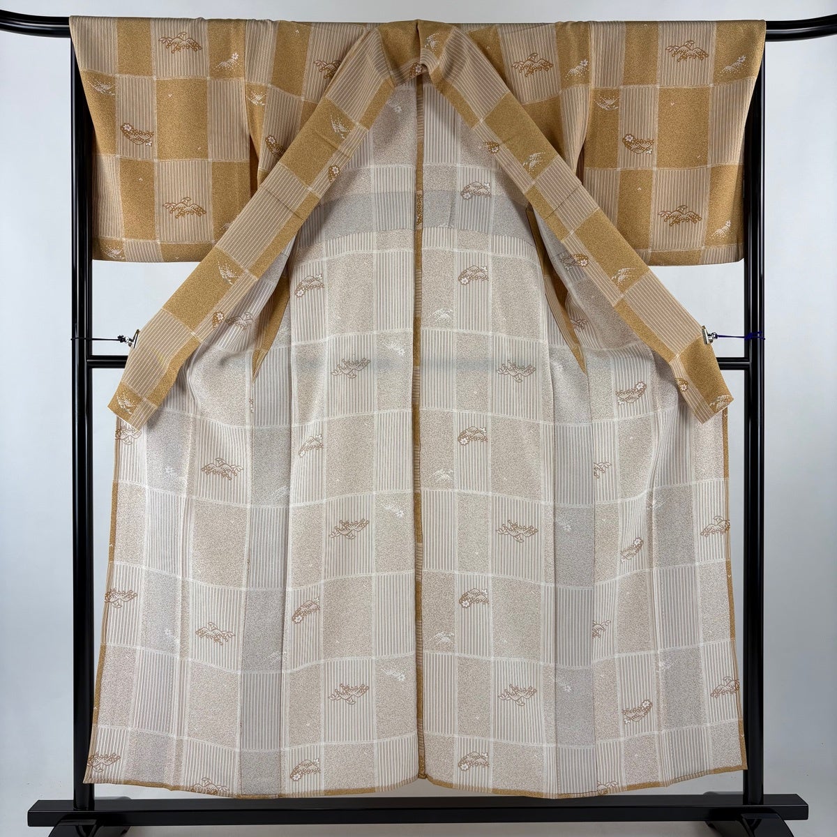 訪問着 身丈163cm 裄丈64cm M 袷 蝶 市松 金彩 薄茶色 正絹 秀品