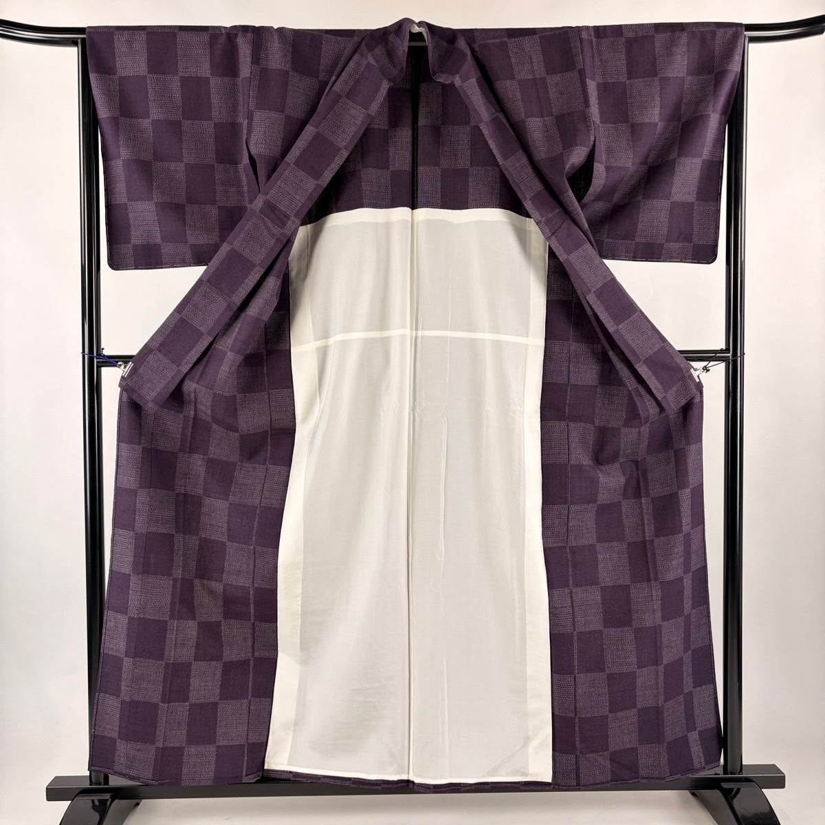 【美品】 小紋 身丈163cm 裄丈68cm L 薄物 洗える着物 市松 青紫 化繊 優品
