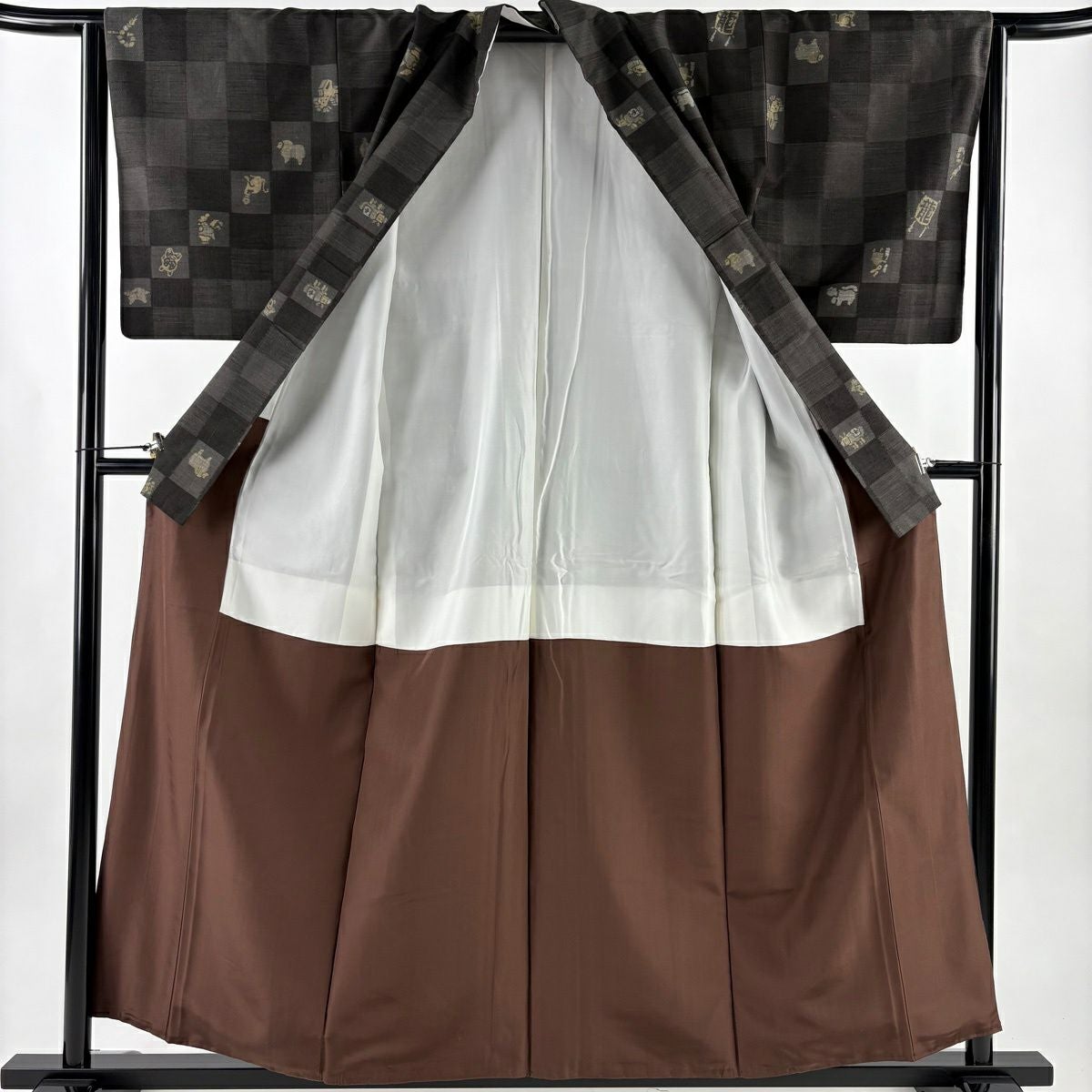 【美品】 紬 身丈164cm 裄丈64.5cm M 袷 華文 市松 焦茶色 正絹 秀品