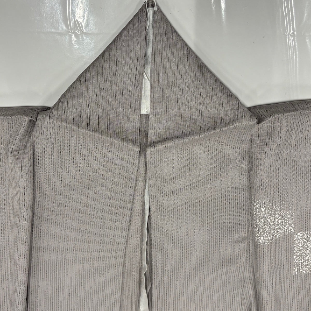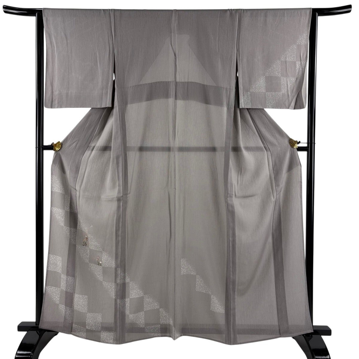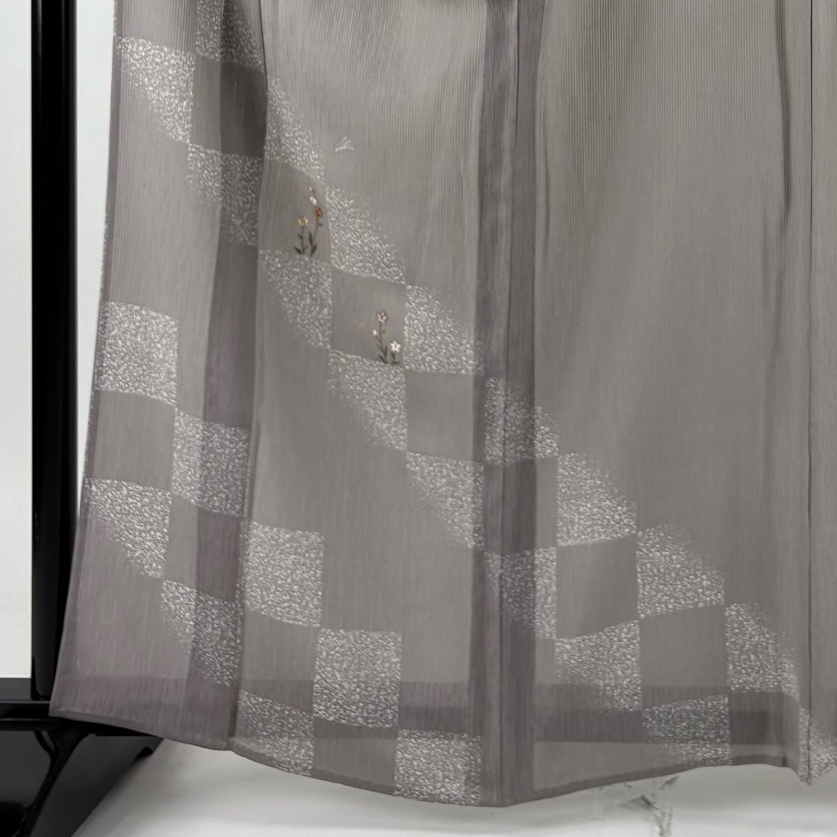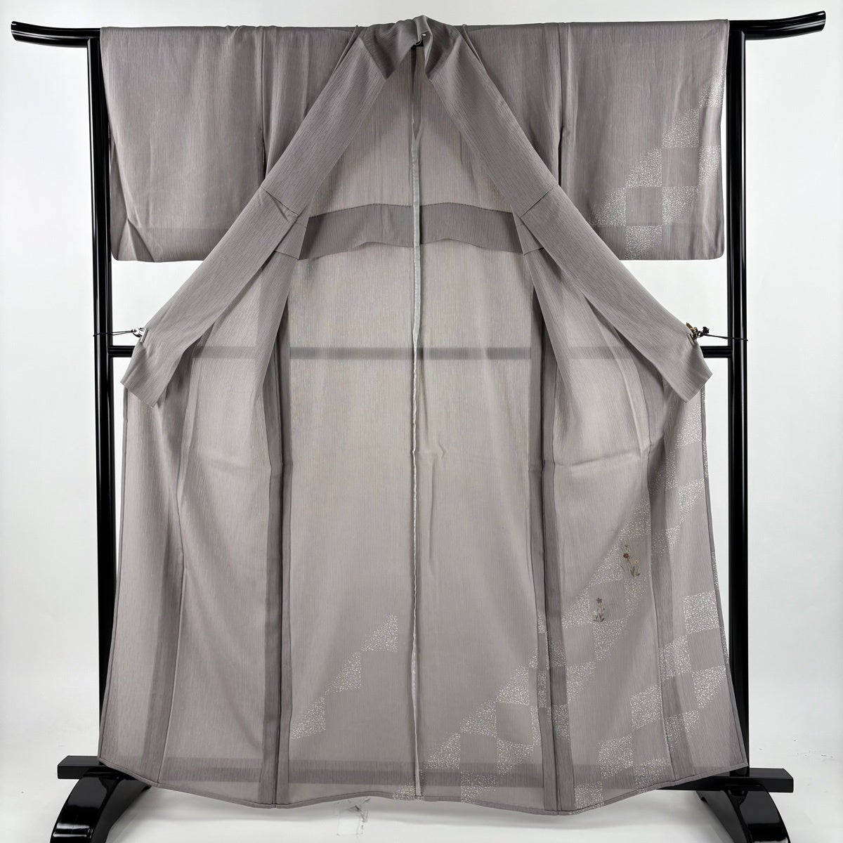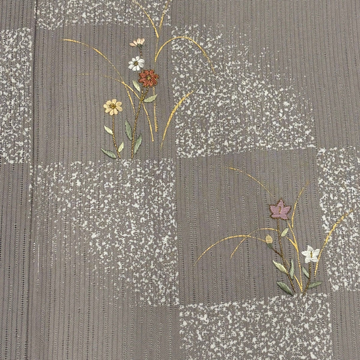 付下げ 身丈162.5cm 裄丈65cm M 薄物 草花 市松 金糸 刺繍 灰紫 正絹 秀品