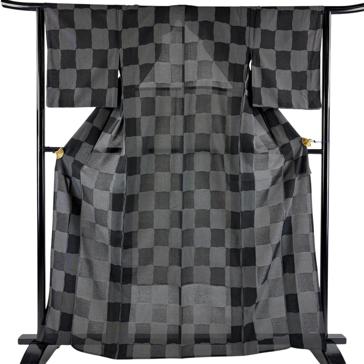 小紋 身丈158.5cm 裄丈62.5cm S 薄物 絽 変わり市松 草花 ぼかし 灰色 正絹 秀品