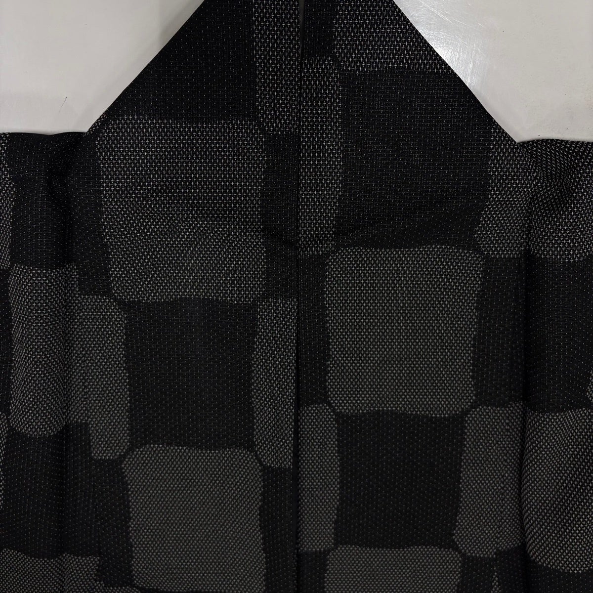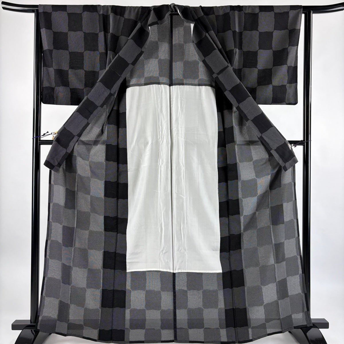 小紋 身丈165cm 裄丈63cm S 単衣 紬地 変わり市松 幾何学 絞り 灰色 正絹 秀品