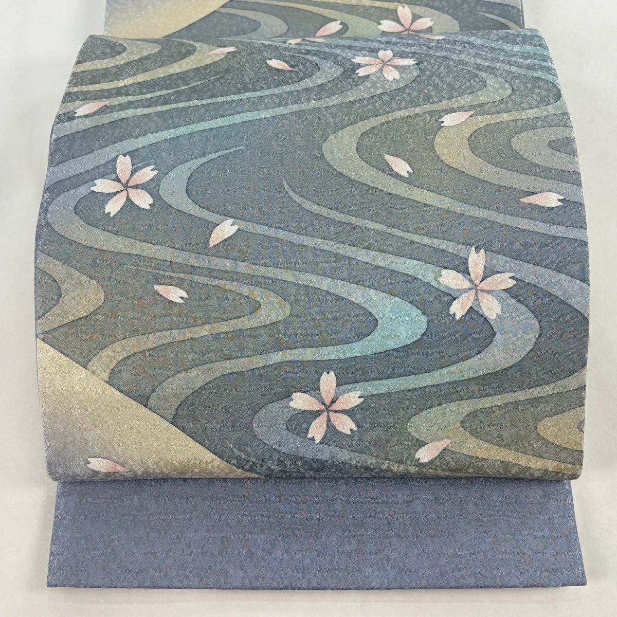 50%OFF 袋帯 名品 鈴乃屋 波頭 幾何学模様 螺鈿 箔 灰色 お太鼓柄 正絹 K50