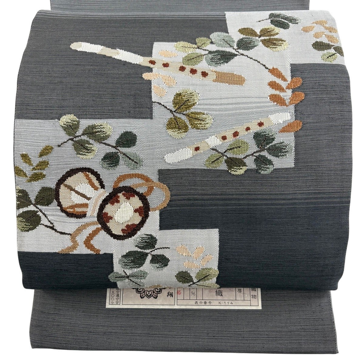 【美品】 袋帯 秀品 証紙あり 紬地 鼓 萩 灰色 お太鼓柄 正絹