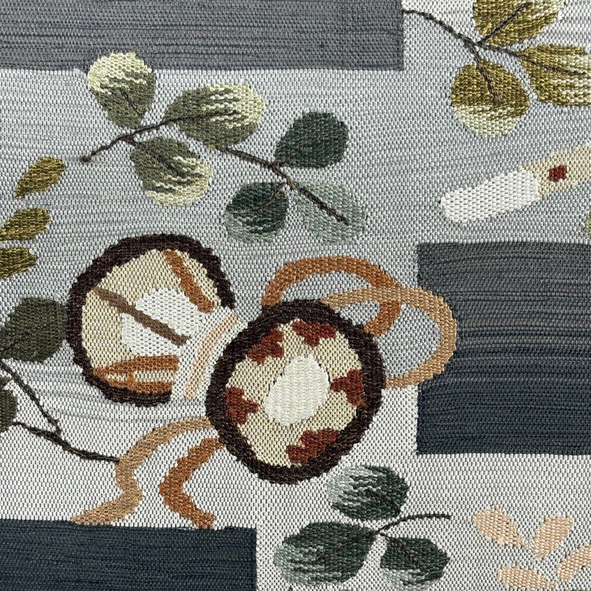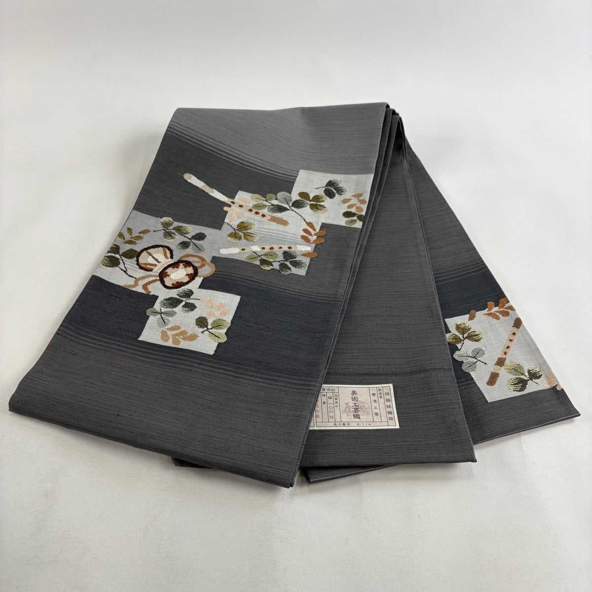 【美品】 袋帯 秀品 服部織物 落款あり 秋草 金銀糸 箔 灰茶 六通 正絹