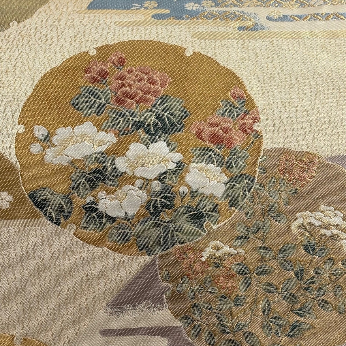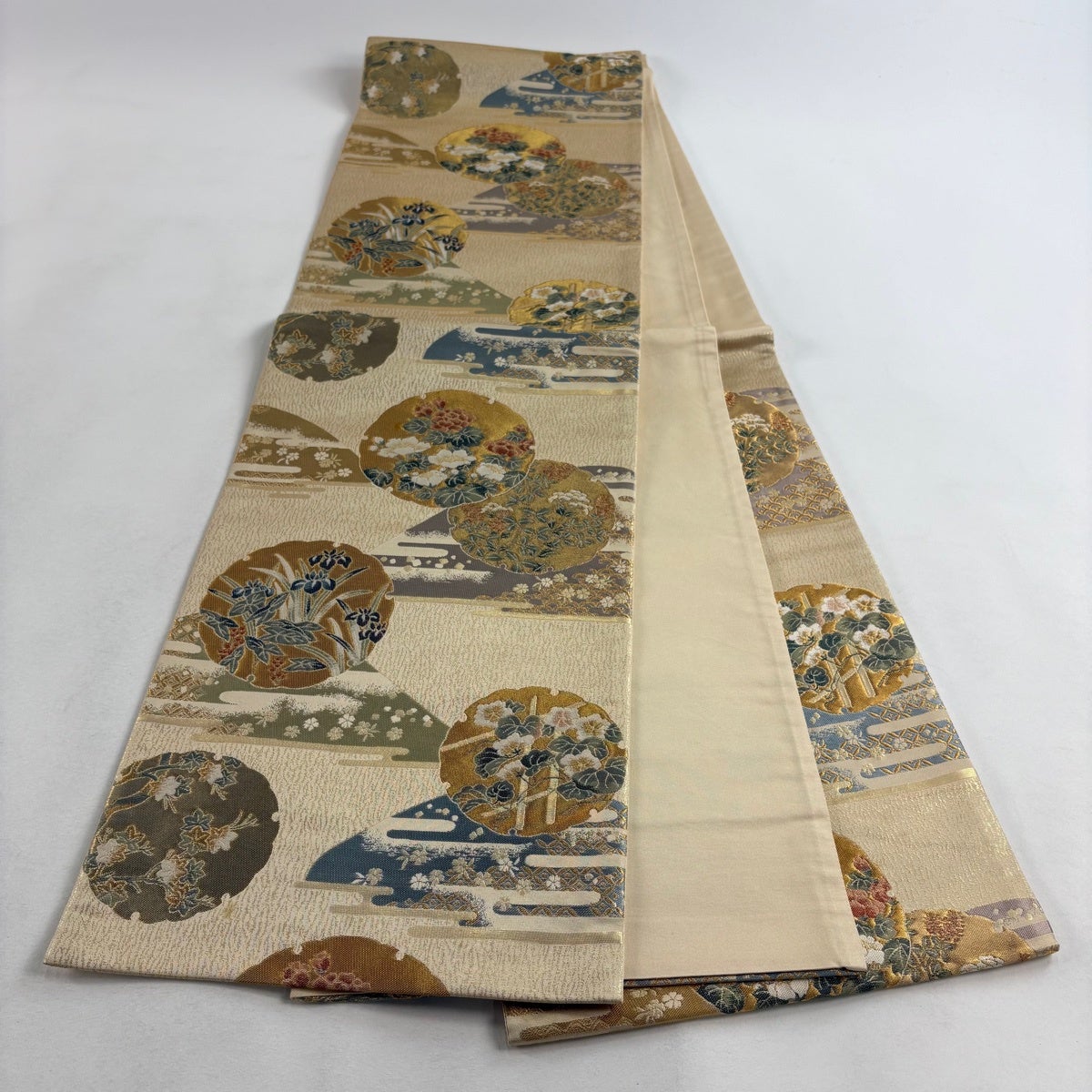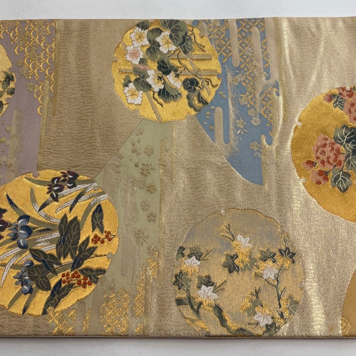 袋帯 秀品 横山清明文 雪輪 草花 金糸 箔 ベージュ 六通 正絹