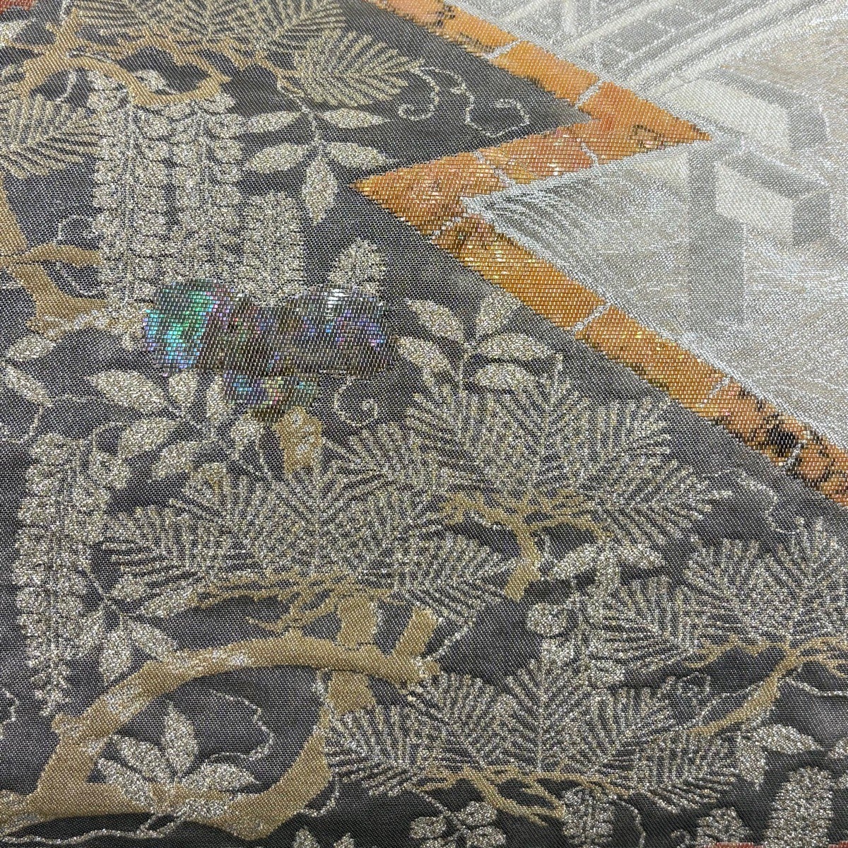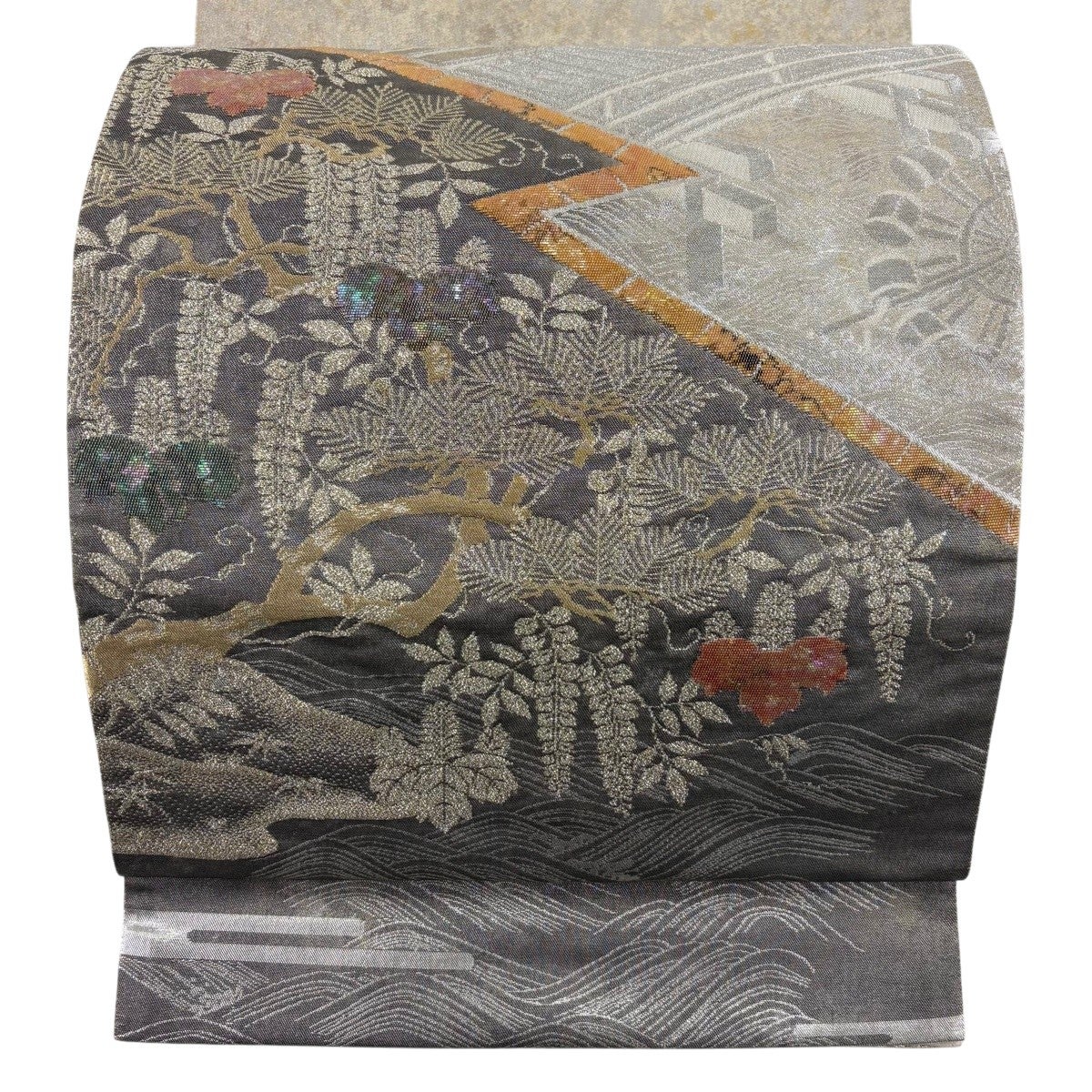 袋帯 秀品 華文 花鳥 箔 刺繍 灰茶 六通 正絹