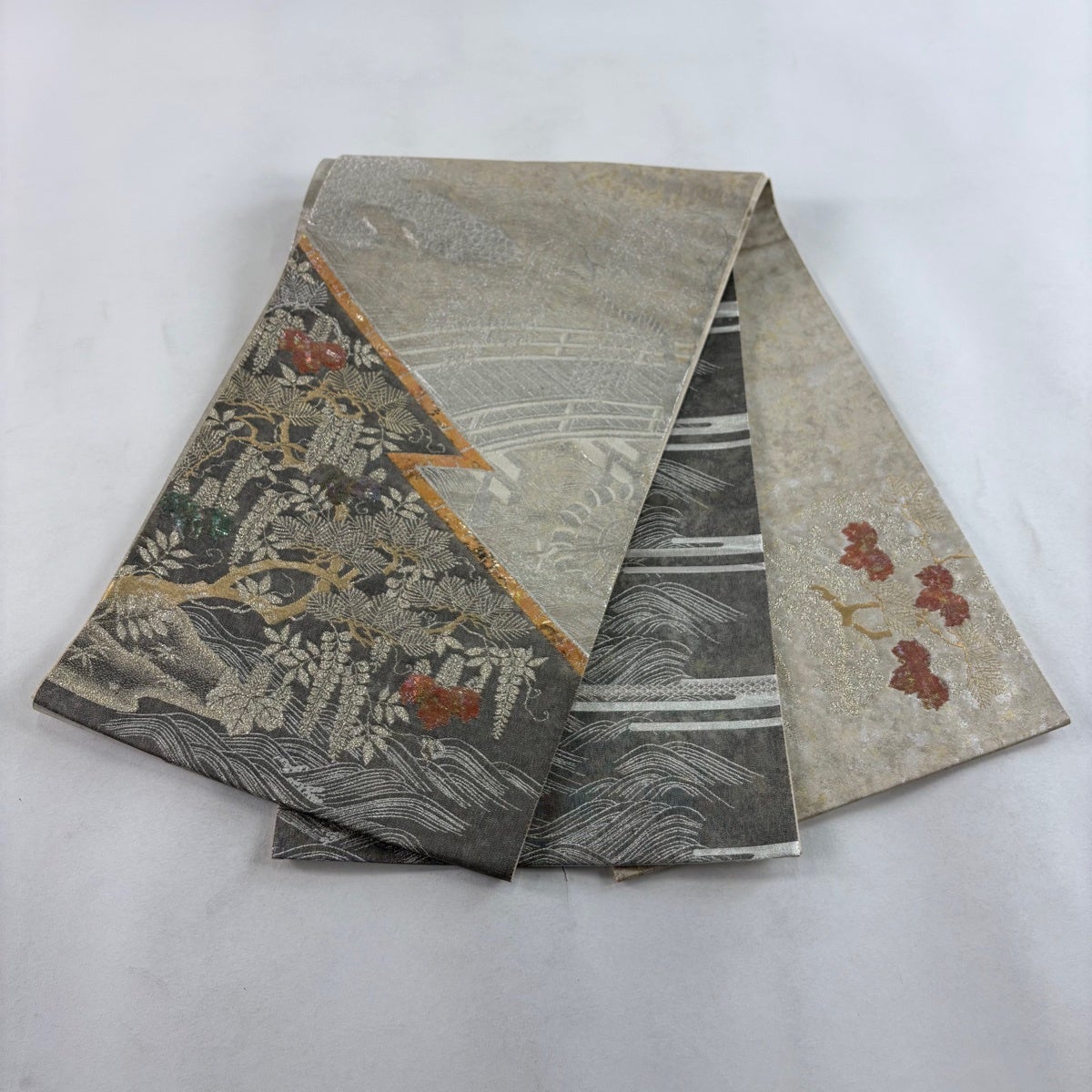袋帯 秀品 横段 櫛 箔 灰白 六通 正絹