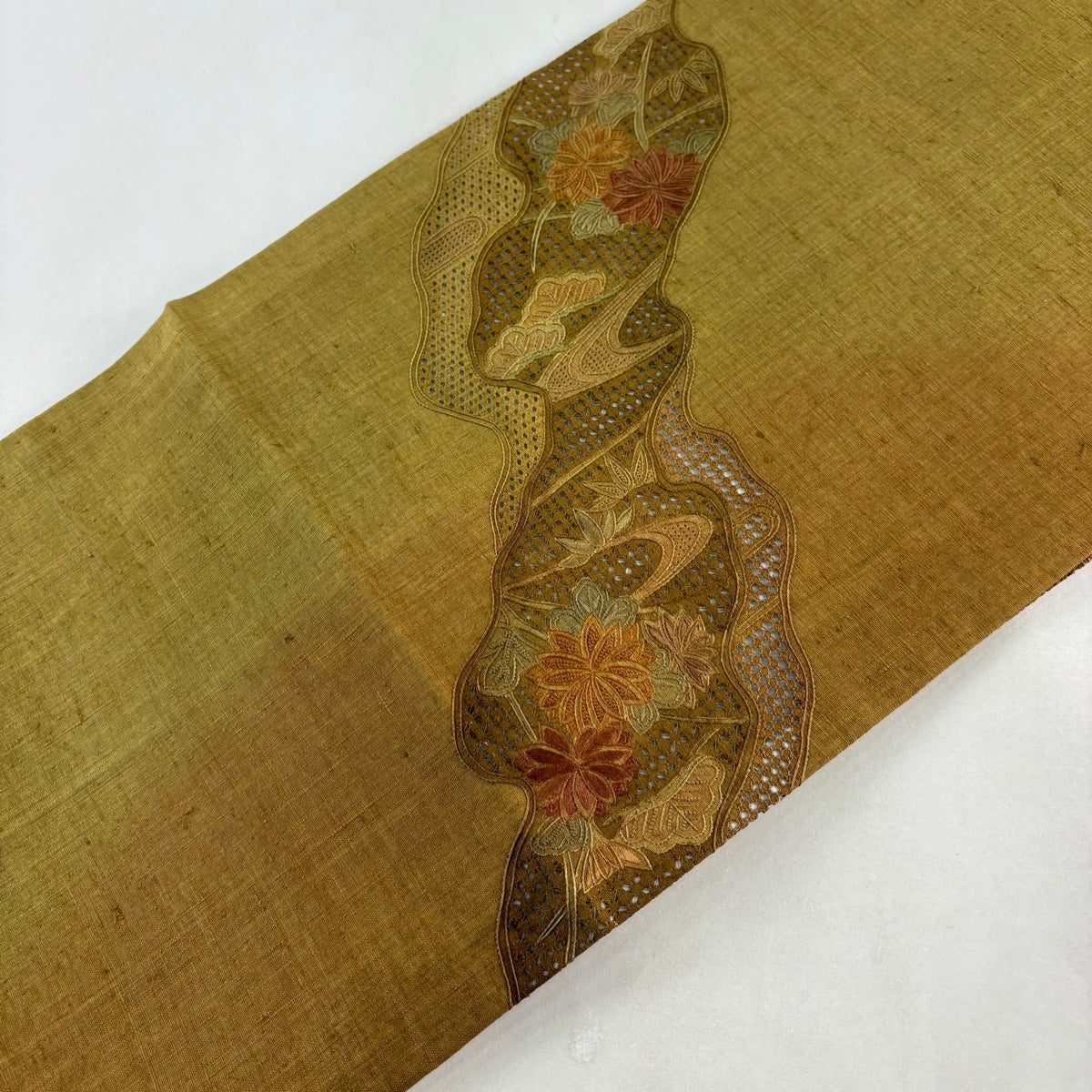 袋帯 秀品 紬地 秋草 松 刺繍 ぼかし 鶯色 お太鼓柄 正絹
