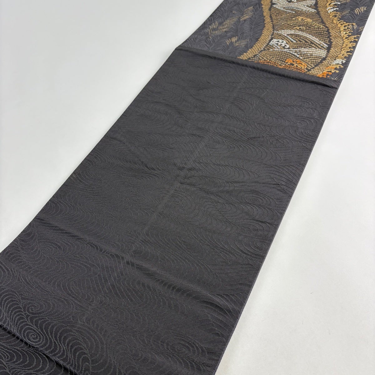 袋帯 秀品 慕情 雪輪 柳 金糸 箔 黒 六通 正絹