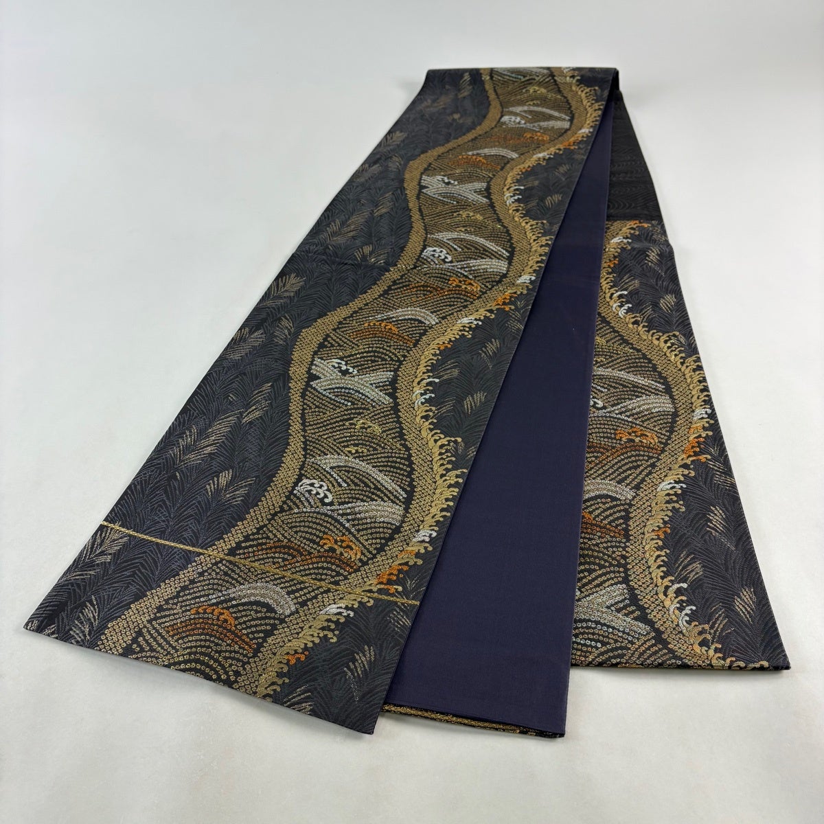 袋帯 秀品 波頭 葉柄 箔 ラメ糸 灰紫 六通 正絹