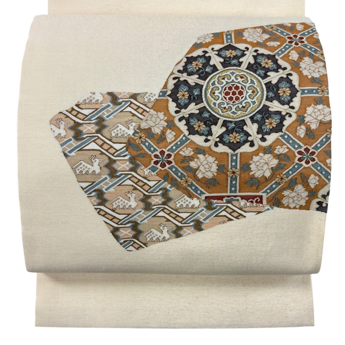 【美品】 袋名古屋帯 逸品 花 幾何学模様 箔 薄茶色 正絹