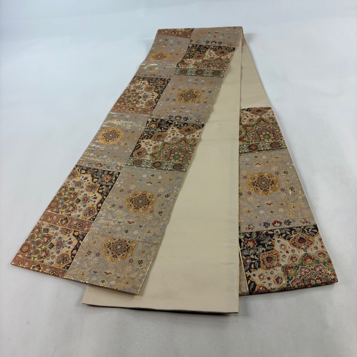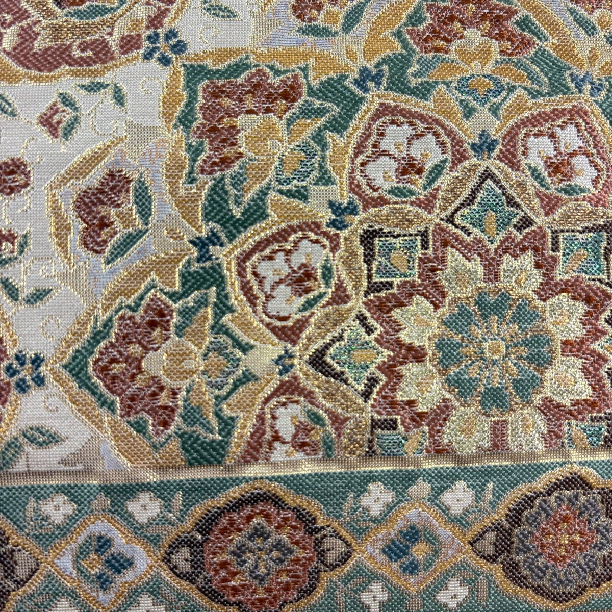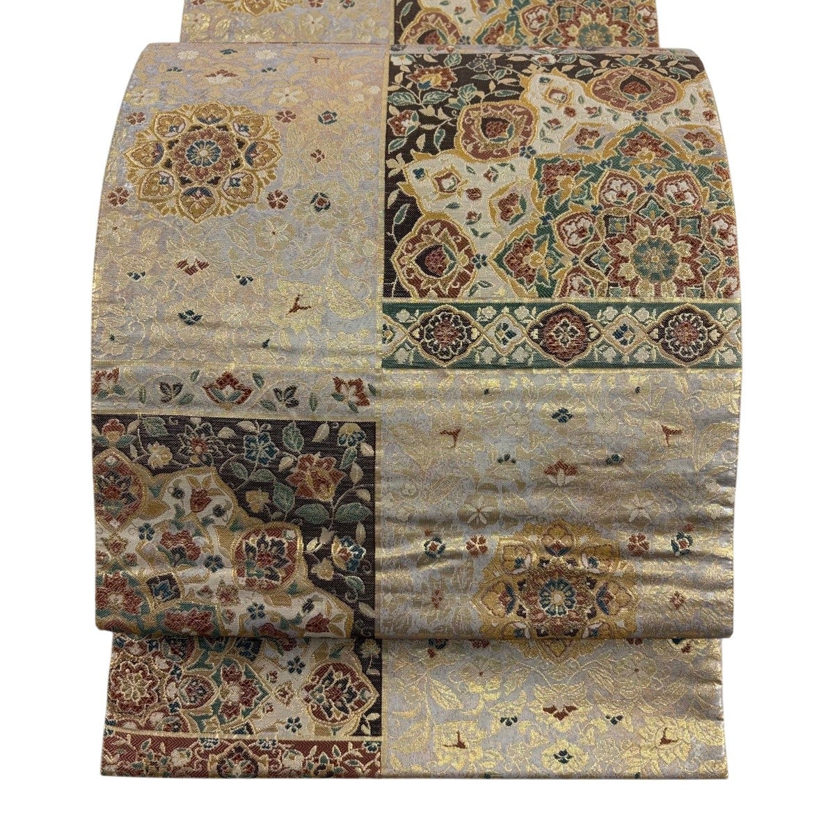 袋帯 秀品 草花 幾何学 金糸 灰緑 六通 正絹